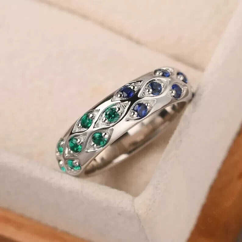 Round Cut Simulated Blue Sapphire Women's Pretty Band Ring 14k White Gold Plated