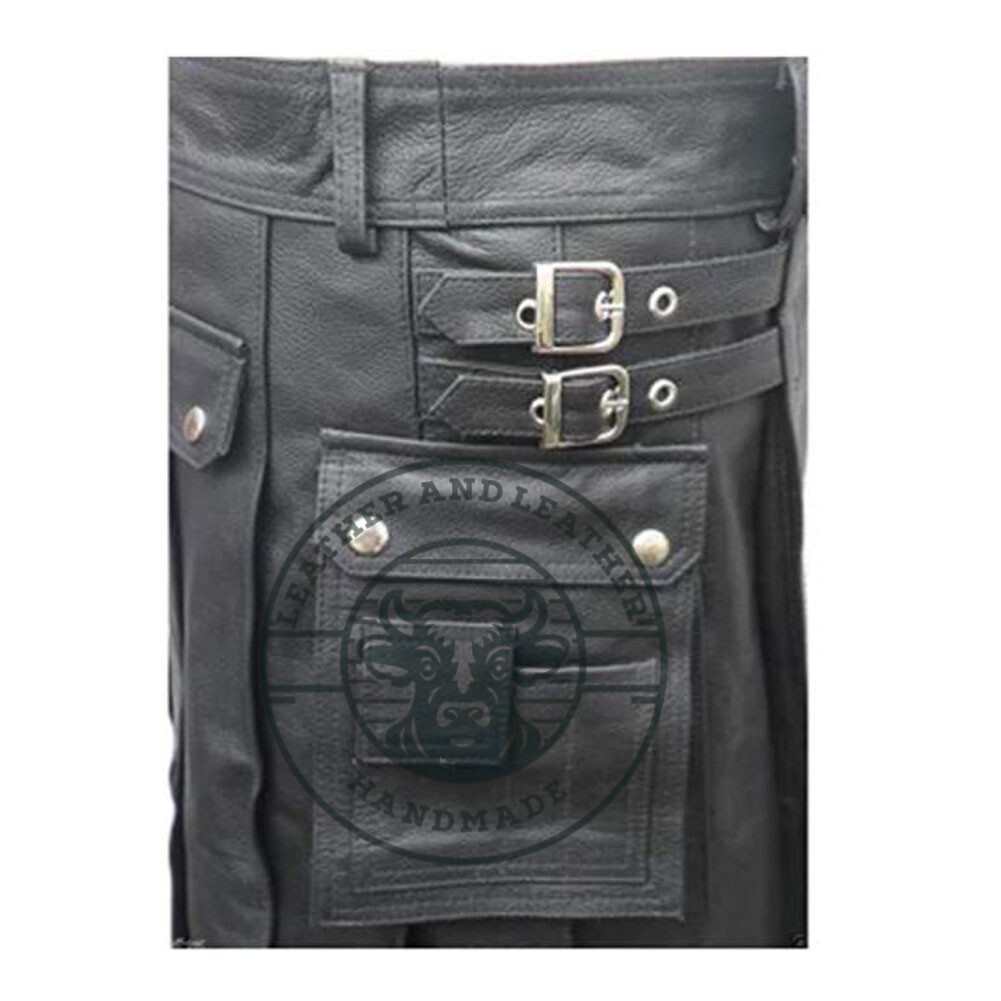 Men's Black Leather Utility Kilt Twin Cargo Pockets Pleated with Twin Buckles