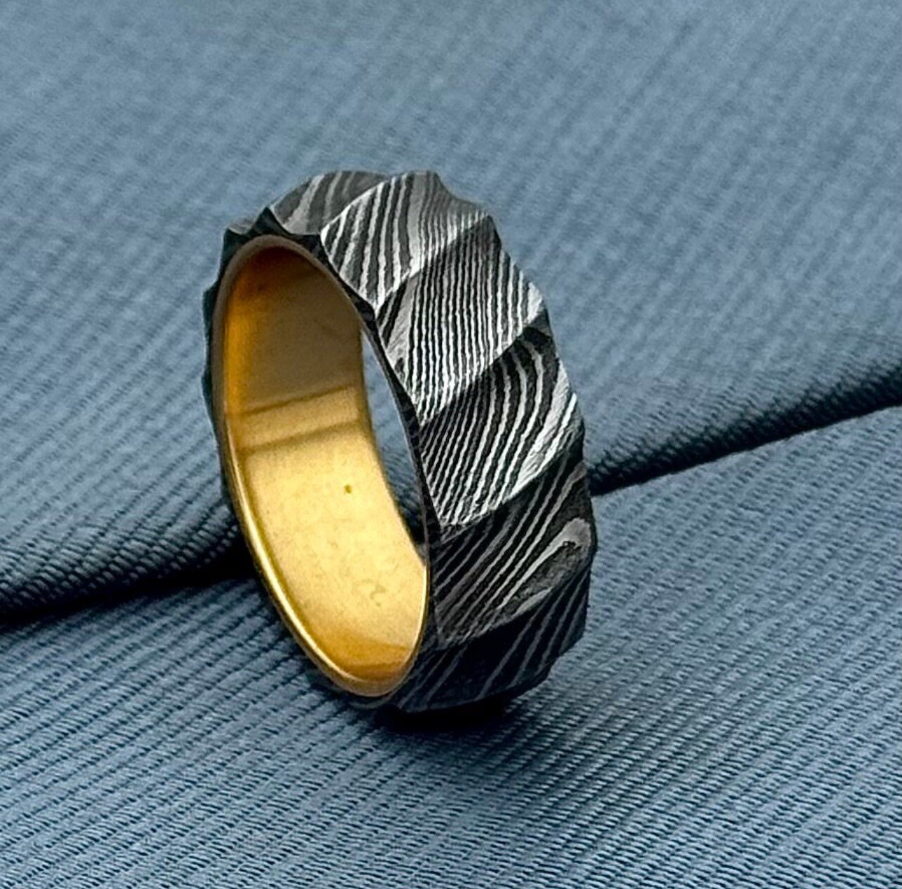 как выглядит Wavy Damascus Ring with Brass Sleeve  Handmade Durable Couple Band Jewelry фото