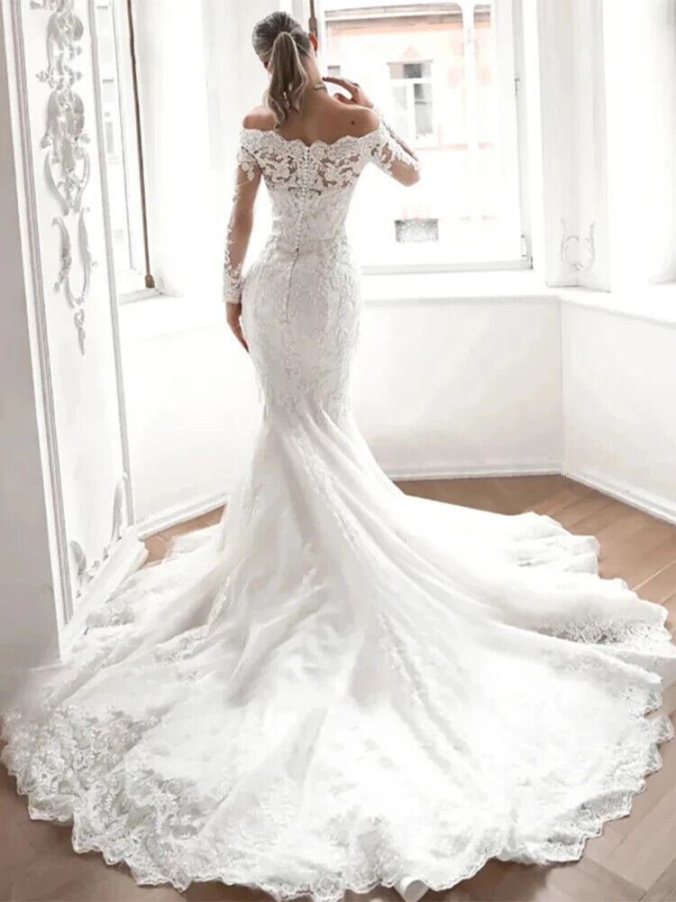 Mermaid Lace Wedding Dresses Beaded Appliques Long Sleeves Bridal Gowns