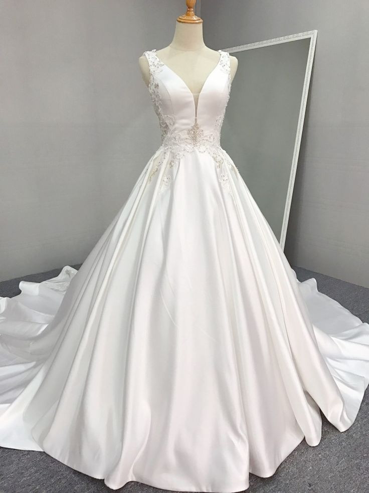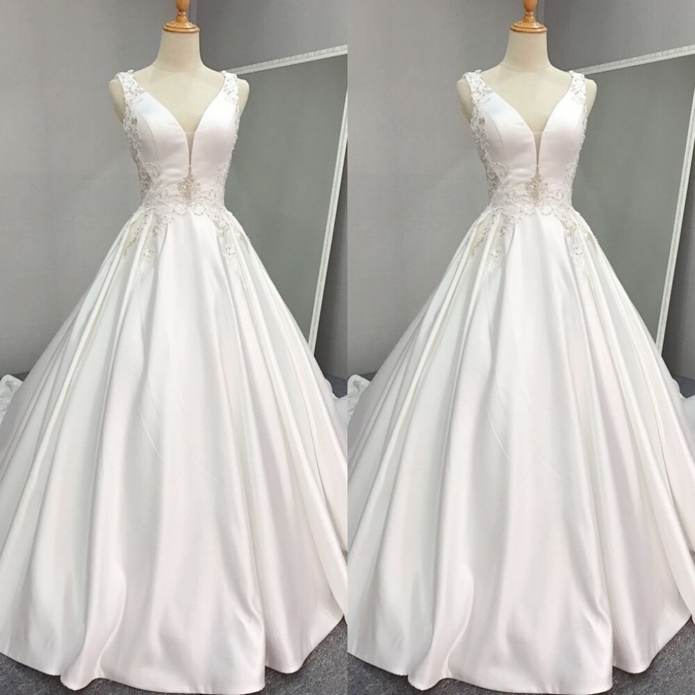 как выглядит Classic Satin Wedding Dresses V Neck Sleeveless A Line Sweep Train Bridal Gowns фото