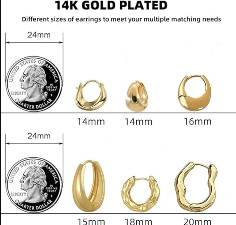 как выглядит 6 Pairs Gold Hoop Earrings Set for Women, 14K Gold Plated Huggie Chunky Earring фото