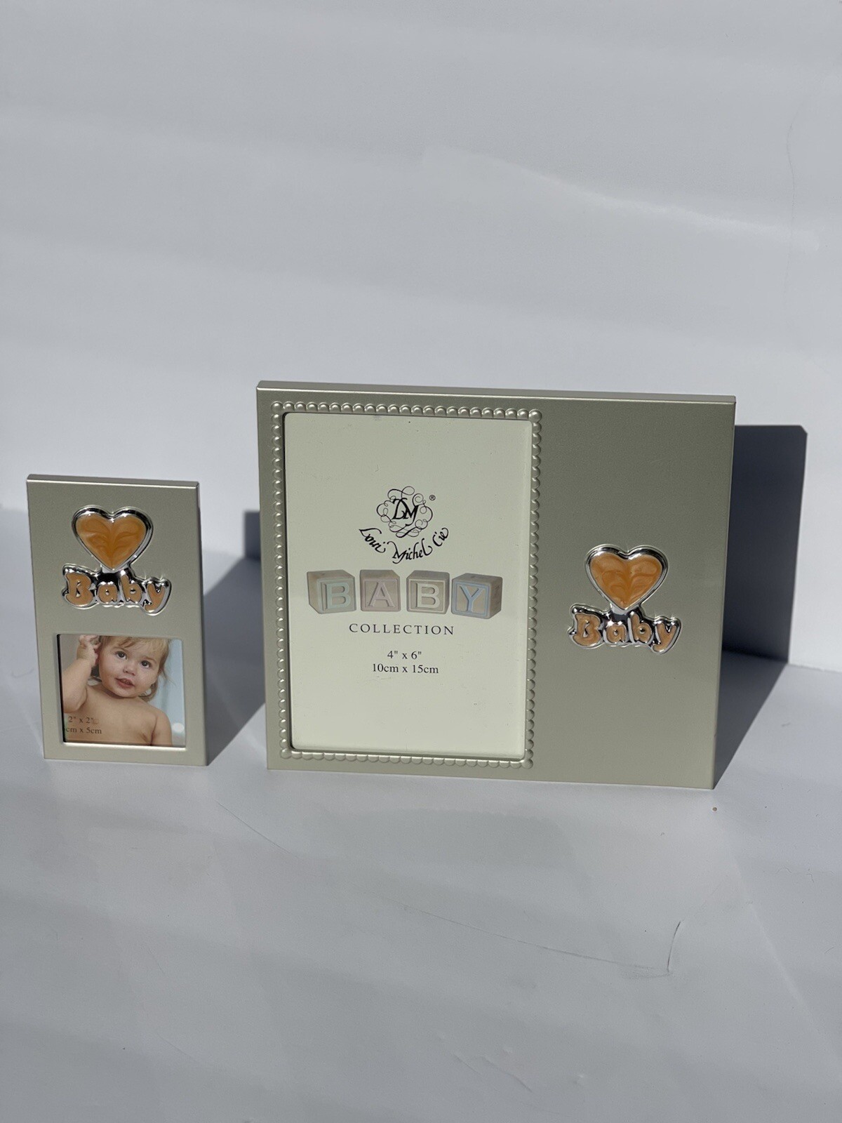 как выглядит BABY GIFT SET OF 2 PHOTO FRAMES IN SILVER WITH HEART ACCENTS BABY SHOWER фото