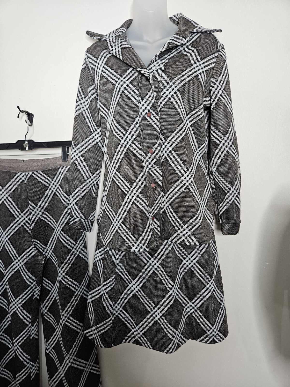 60s 70s Vintage VII Women's Hippy Mod Polyester Plaid Leisure Pant Skirt Suit