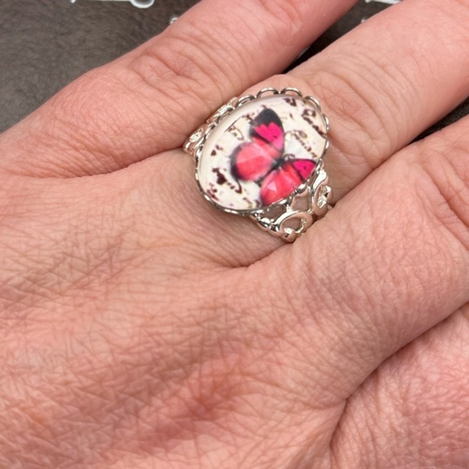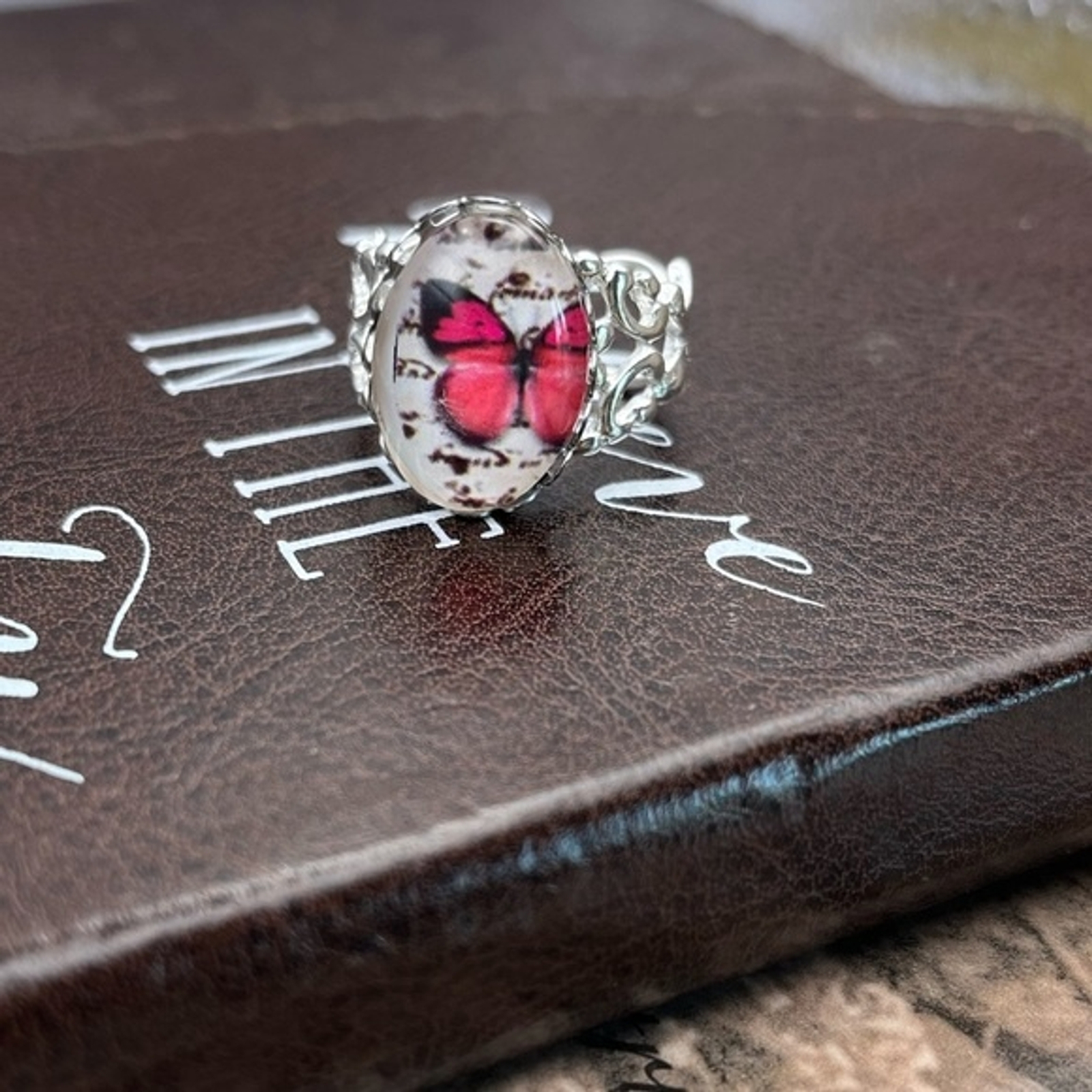 Red Monarch Butterfly Glass Stainless Steel Filigree Ring