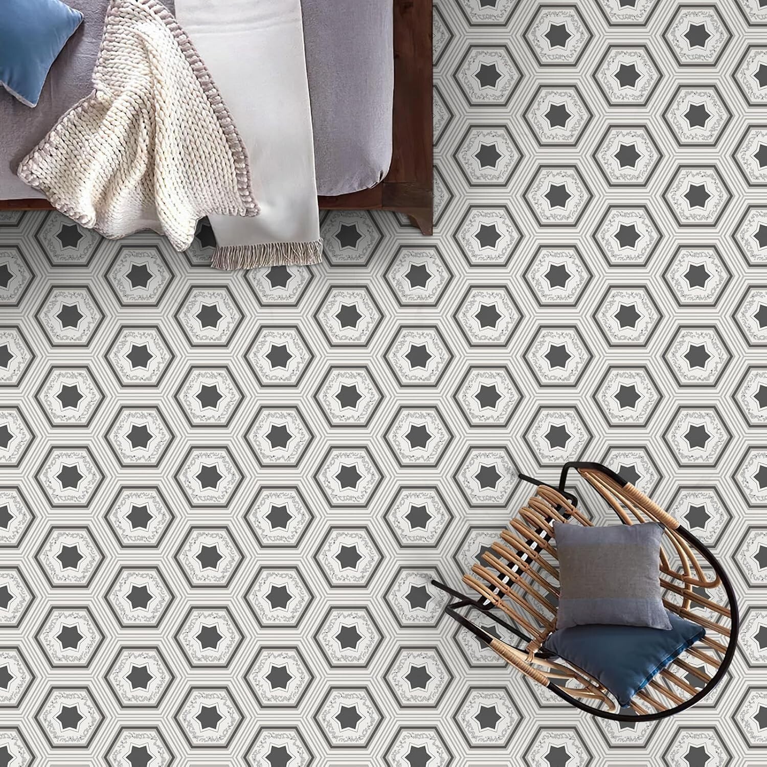 как выглядит MORCART 20-Pack Hexagon Peel and Stick Floor Tile - Pentagon Pattern, 12.6 Sq Ft фото