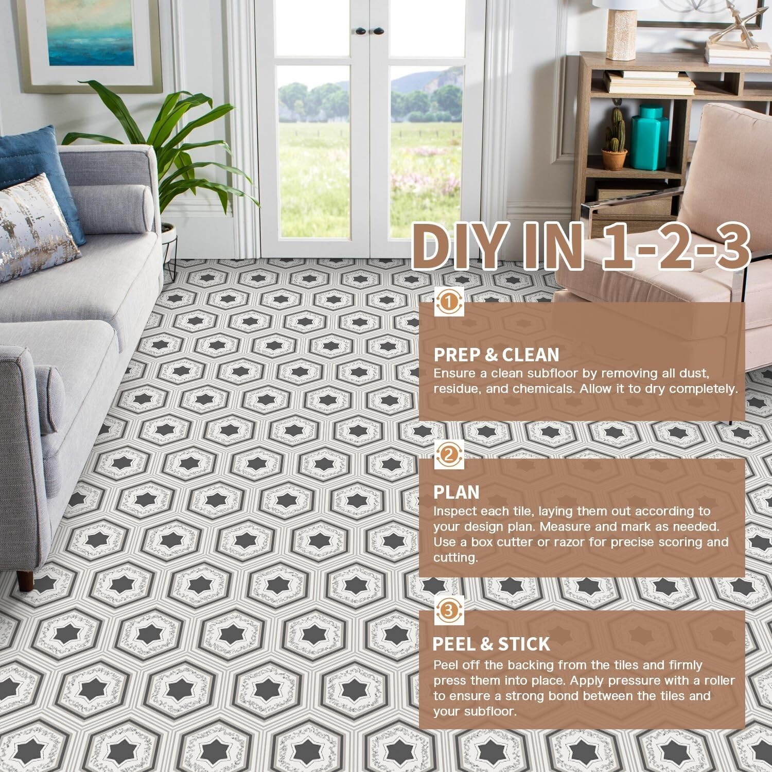 MORCART 20-Pack Hexagon Peel and Stick Floor Tile - Pentagon Pattern, 12.6 Sq Ft