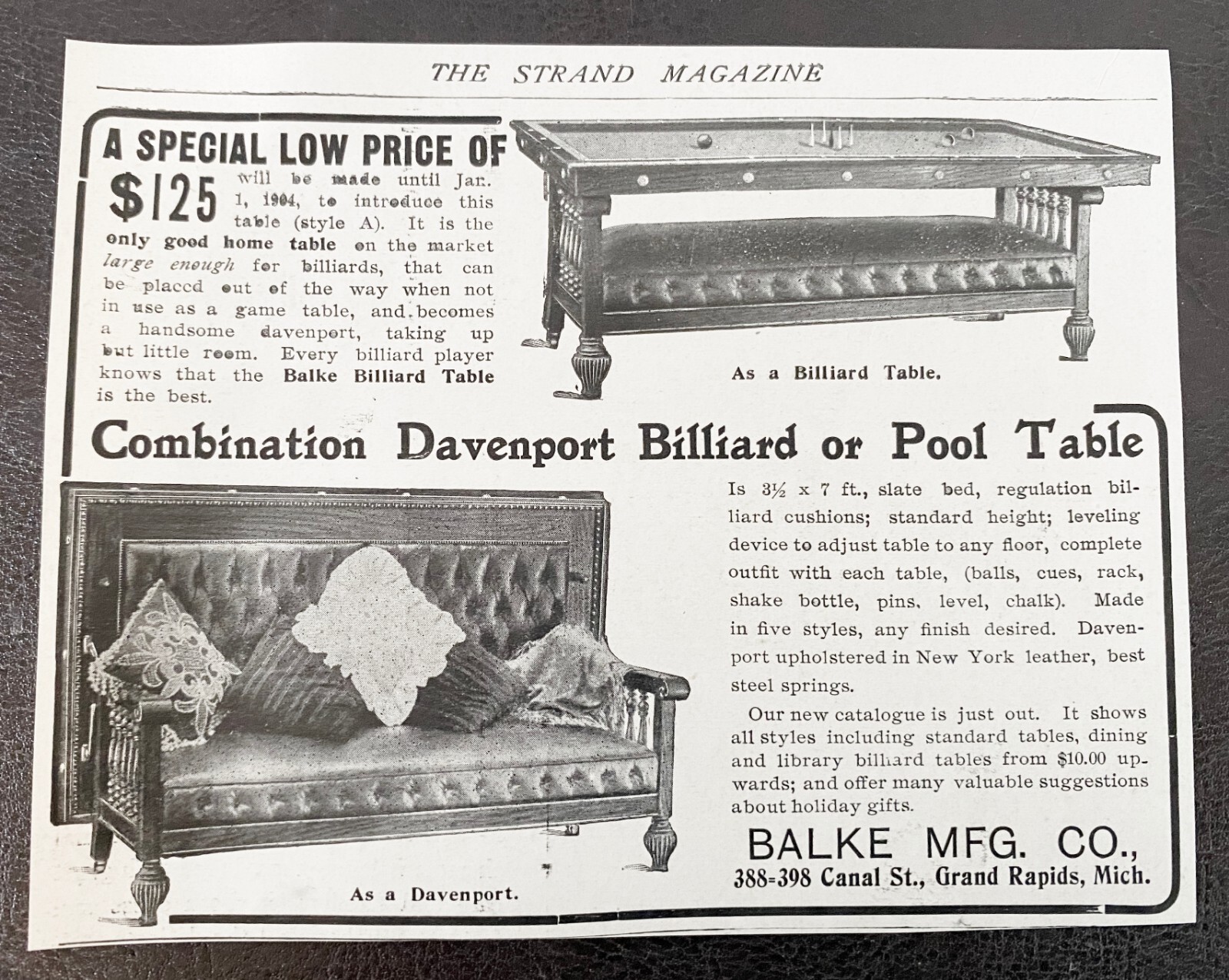 BALKE Combination Davenport Billiard Pool Table 1903 Print Ad Grand Rapids,Mich.