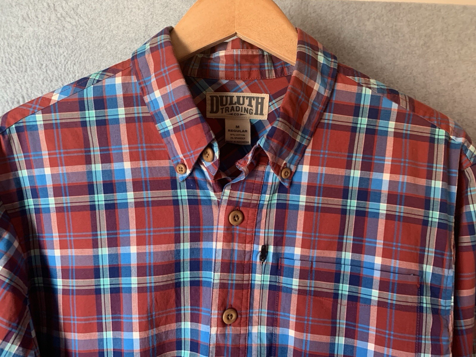 как выглядит Duluth Trading Co Mens Plaid Button Down Shirt Sz M Zipper Pocket Red Multicolor фото