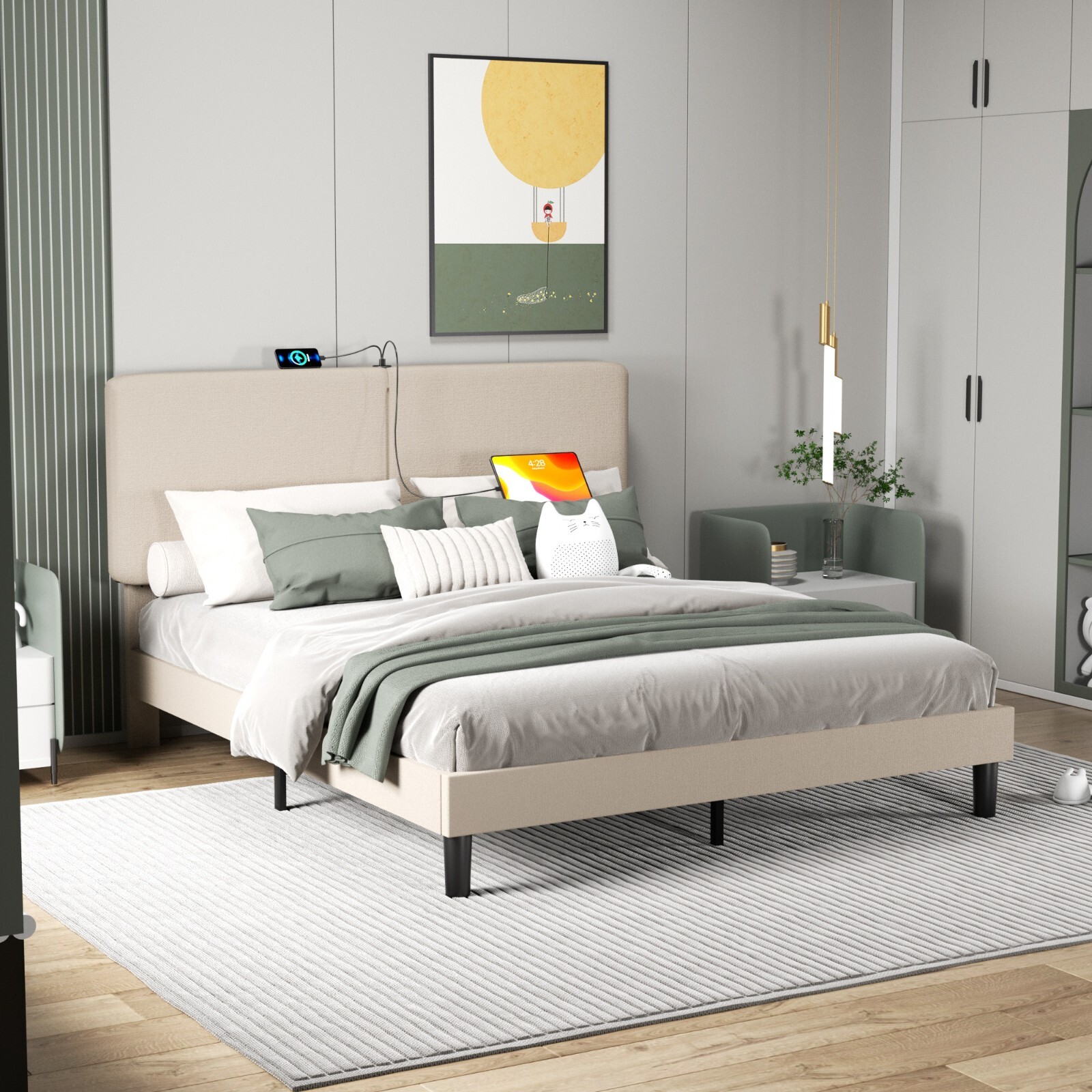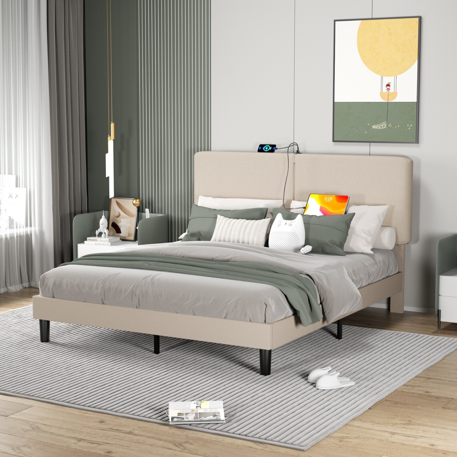 Bed Frame with USB Charging Station Headboard Twin Full Queen Size Platform Bed
