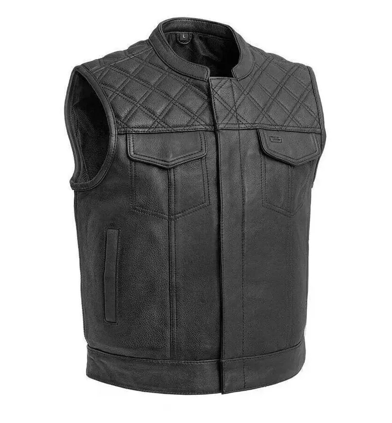 Men's Black Leather Motorbike Vest Diamond Motorcycle Vest Concealed Waistcoat