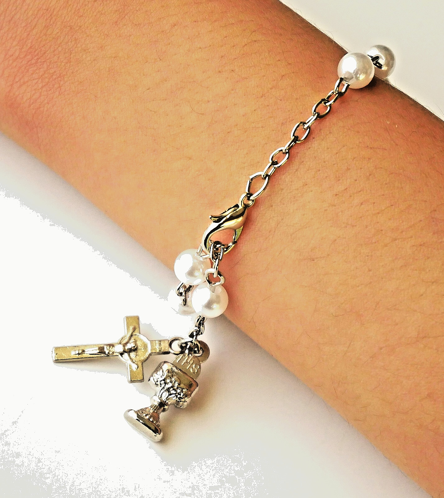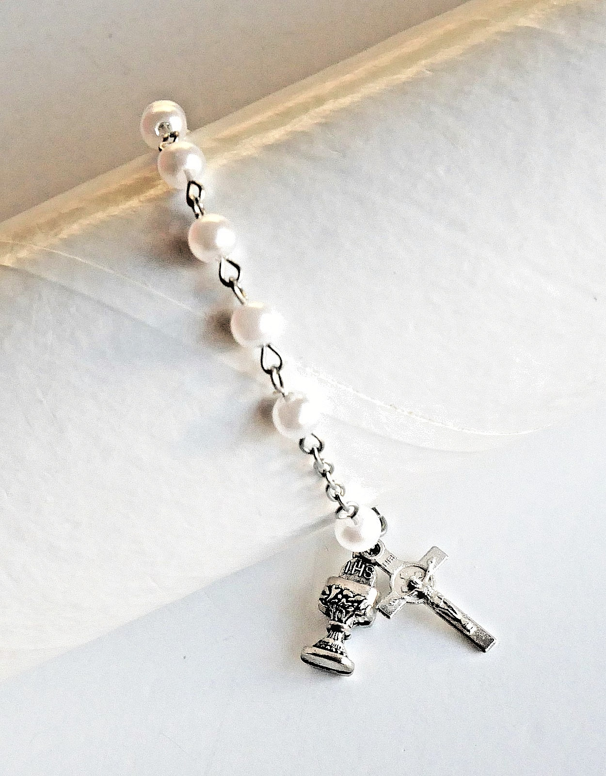 First Communion Rosary Bracelet with Artificial Pearl Beads and Dangles
