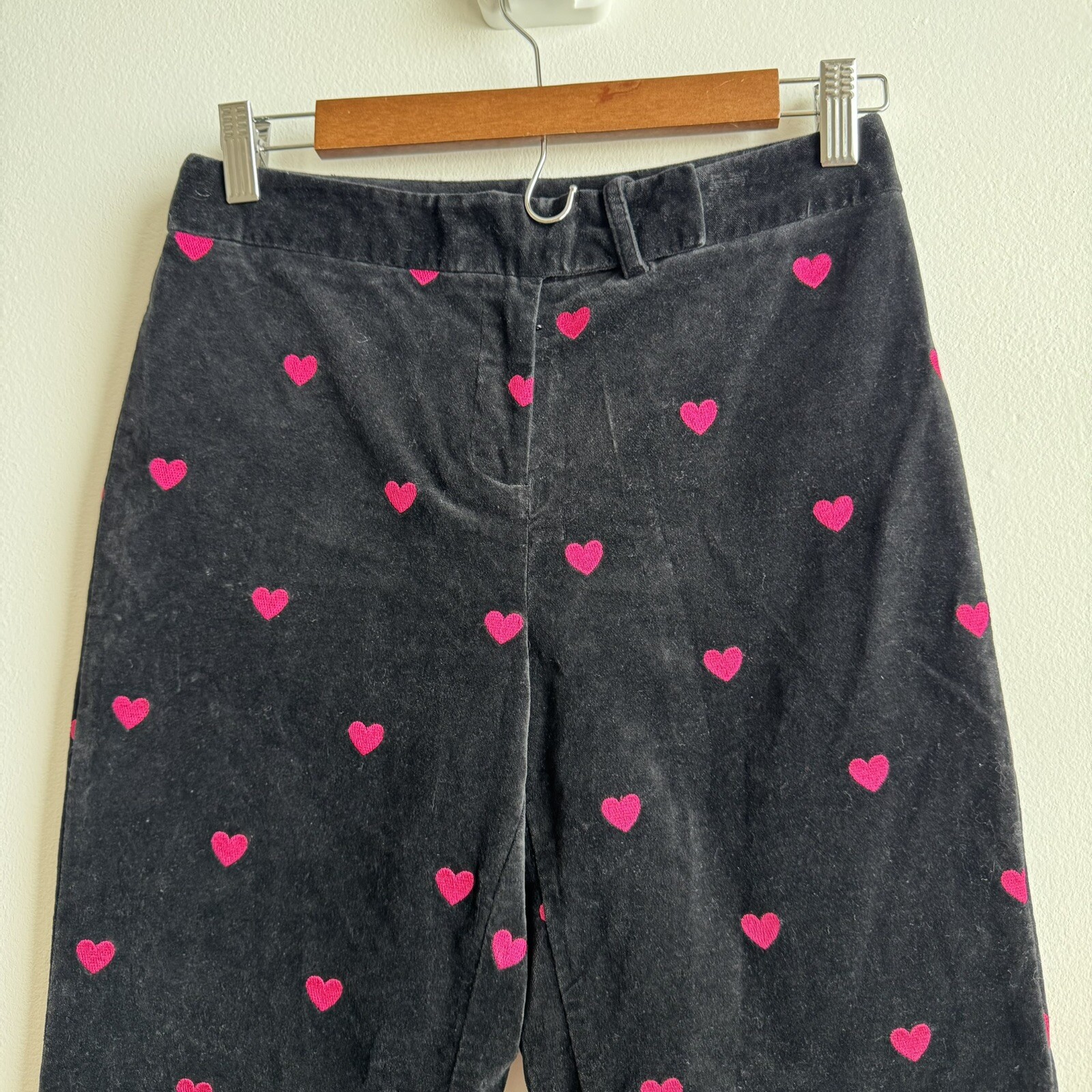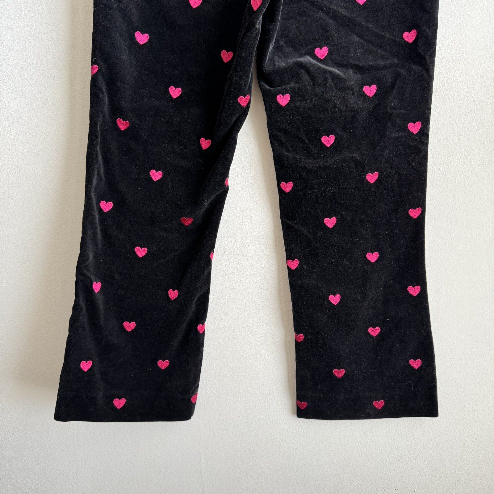 как выглядит LILLY PULITZER Black Embroidered Hearts Stretch Velvet Flared Pants Size 2 VTG фото