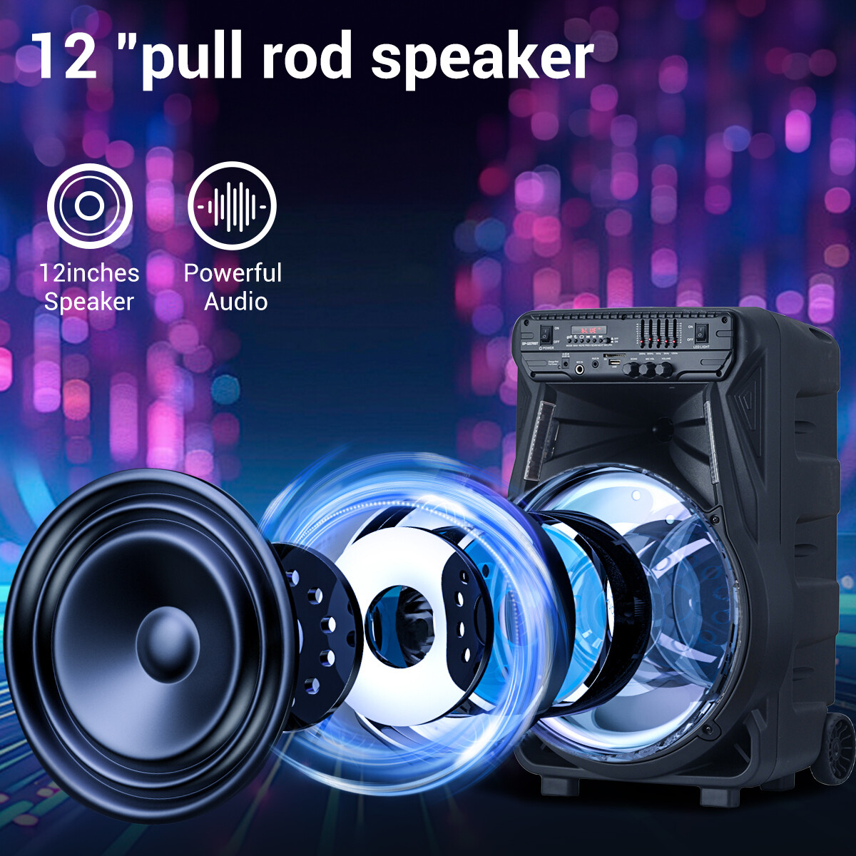 Portable Bluetooth Party Speaker 12'' Woofer High Power TWS LED w/Trolley Wheels