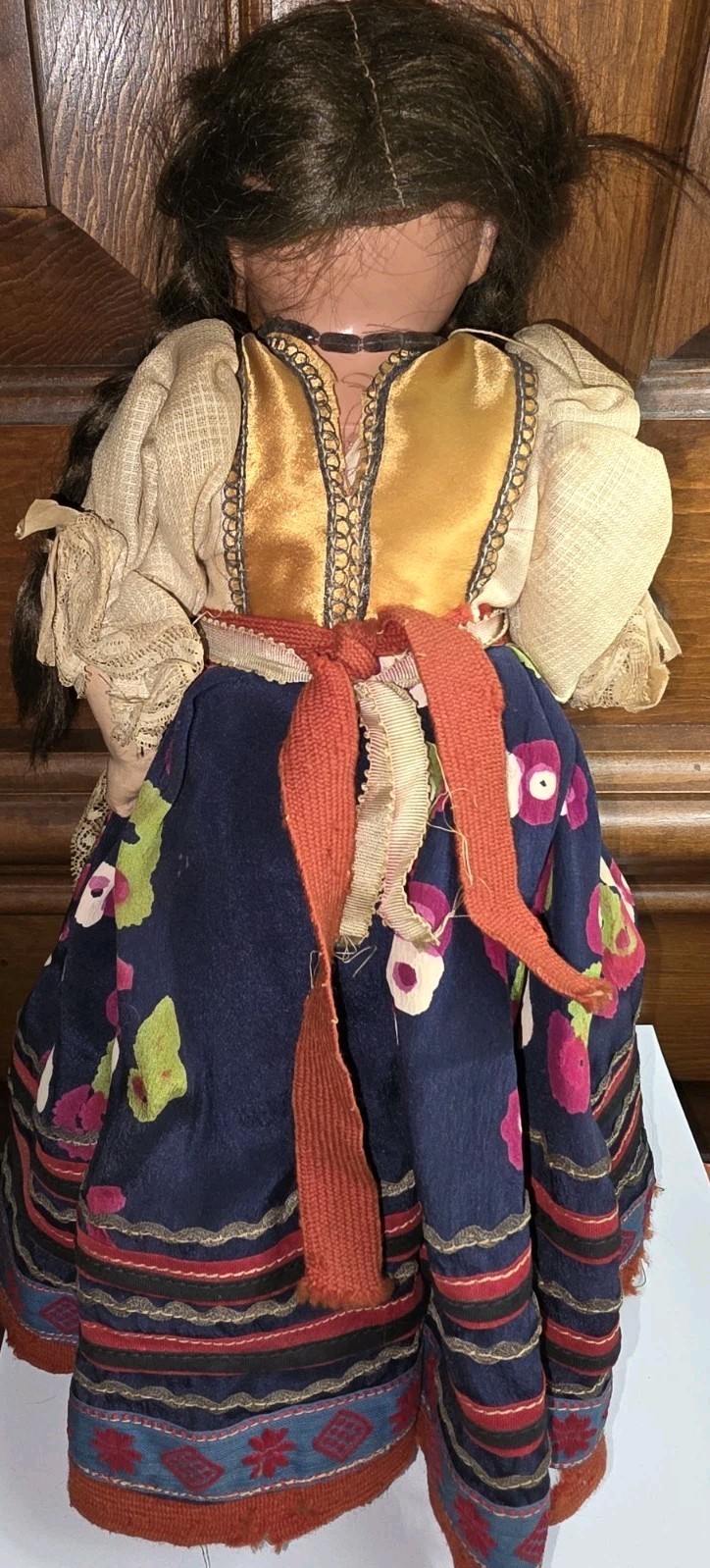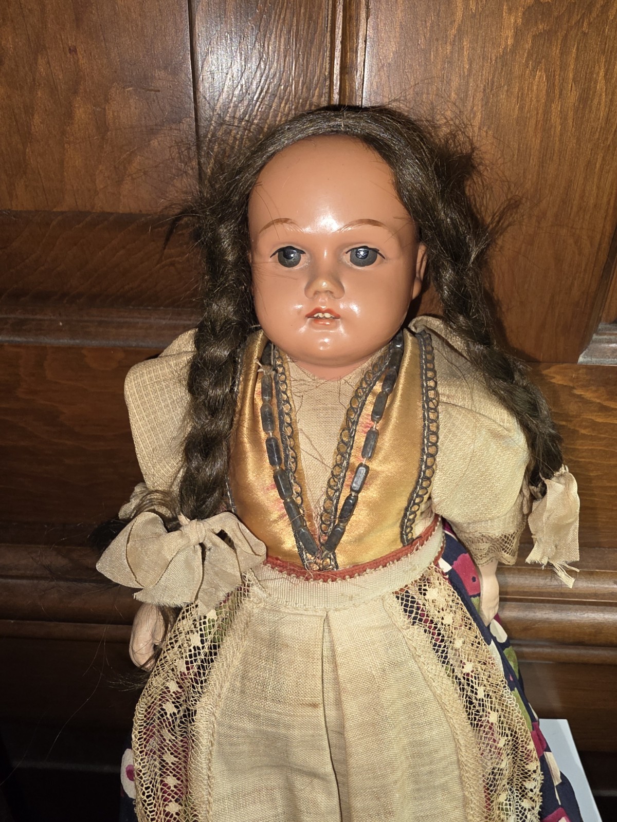 как выглядит Antique Schildkrot German celluloid composition jointed doll painted eyes 13 фото