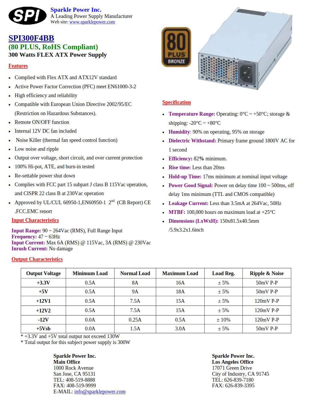 SPI300F4BB SPI 300W Flex ATX PSU AC/DC 12V/5V/3.3V Switching Power Supply