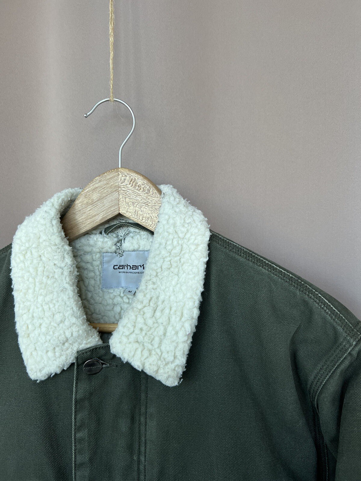 как выглядит Carhartt Mens Denim Fairmount Coat Sherpa Lined Size M Green Vintage Button фото