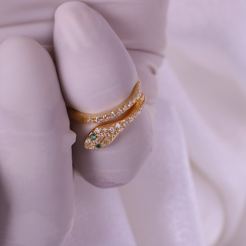 как выглядит Gold plated Snake Ring with CZ Emerald Eyes  Adjustable Serpent Jewelry фото