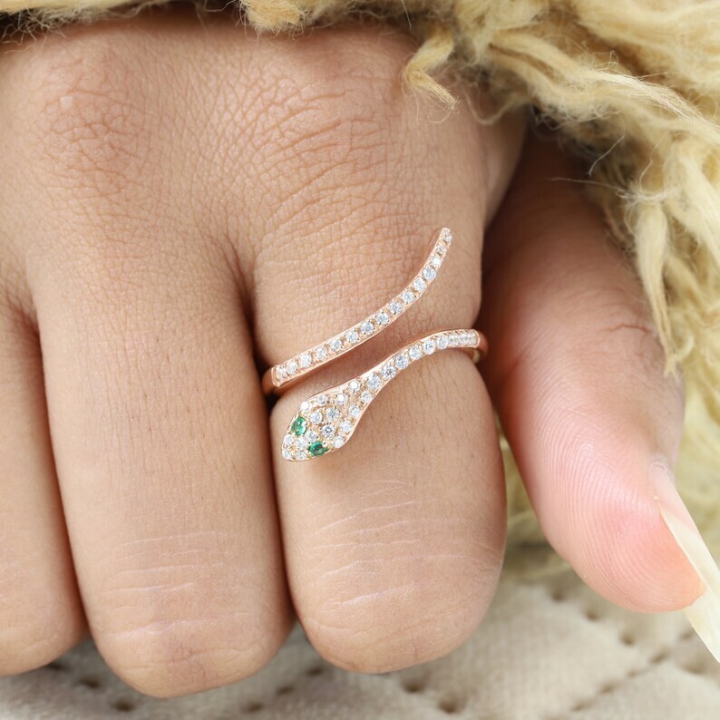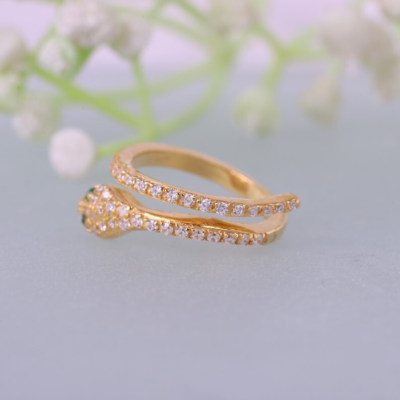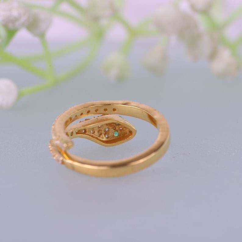 Gold plated Snake Ring with CZ Emerald Eyes Adjustable Serpent Jewelry