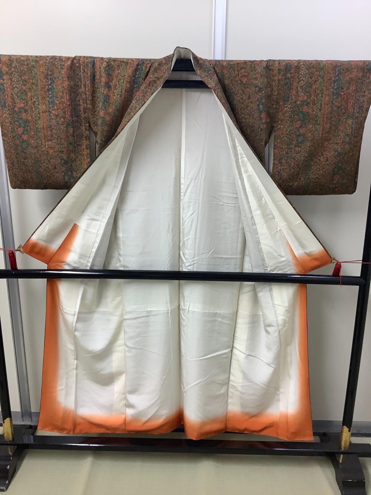 Japanese Vintage Kimono Pure Silk Brown Green Expensive tradition Height 62.2in