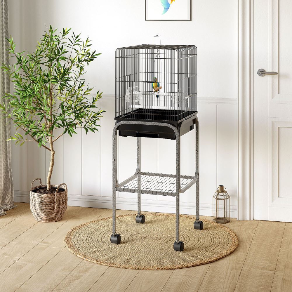 Metal Parrot Cage w/Rolling Stand-Indoor Bird Aviary w/Detachable Storage Basket