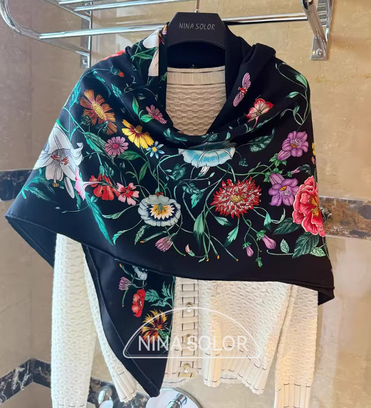 как выглядит 70 cashmere 30 silk Black flower double side printed square Wrap shawl 51