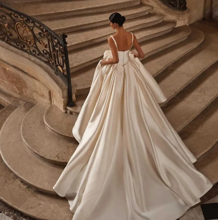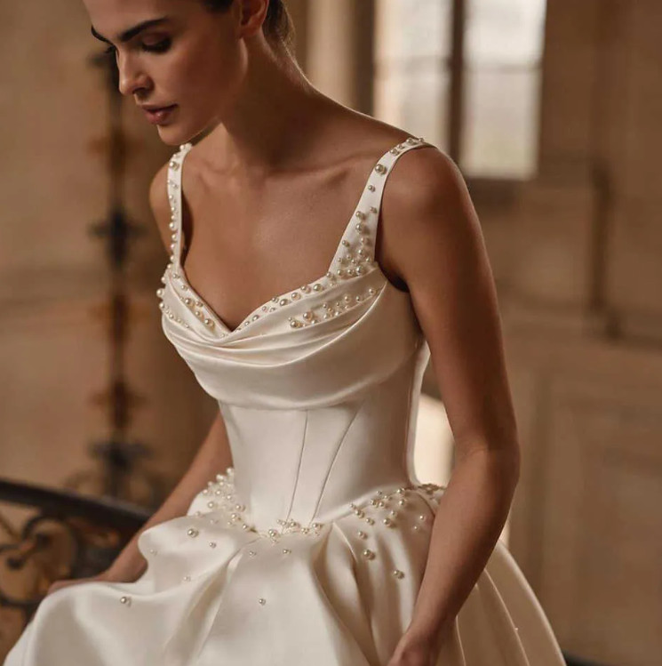 как выглядит Elegant Pearls Wedding Dresses Spaghetti Straps Bride Gowns A Line Satin фото