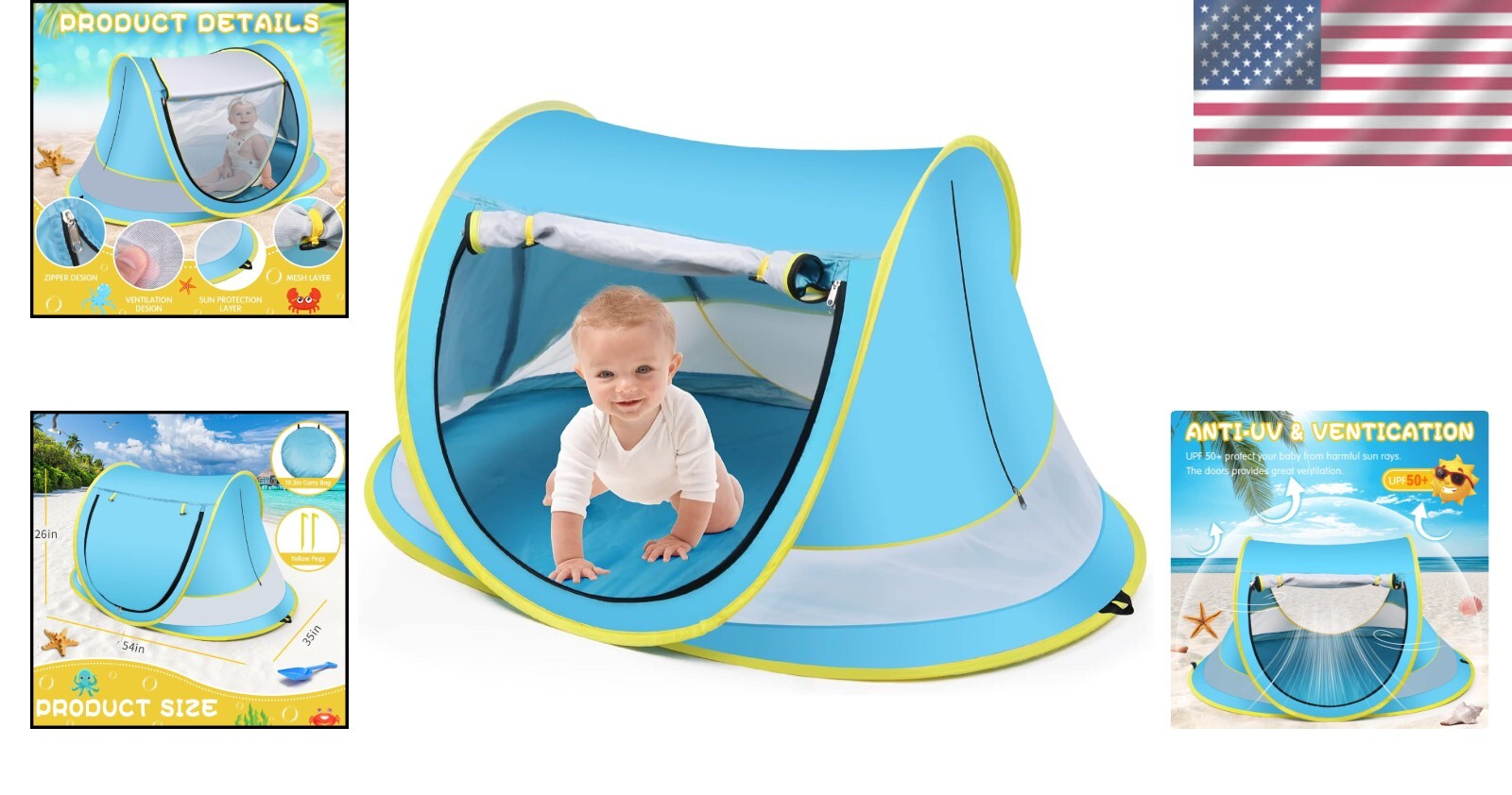 Large UPF 50 Baby Beach Tent - Pop-Up Sun Shade with Mosquito Net, 54x35