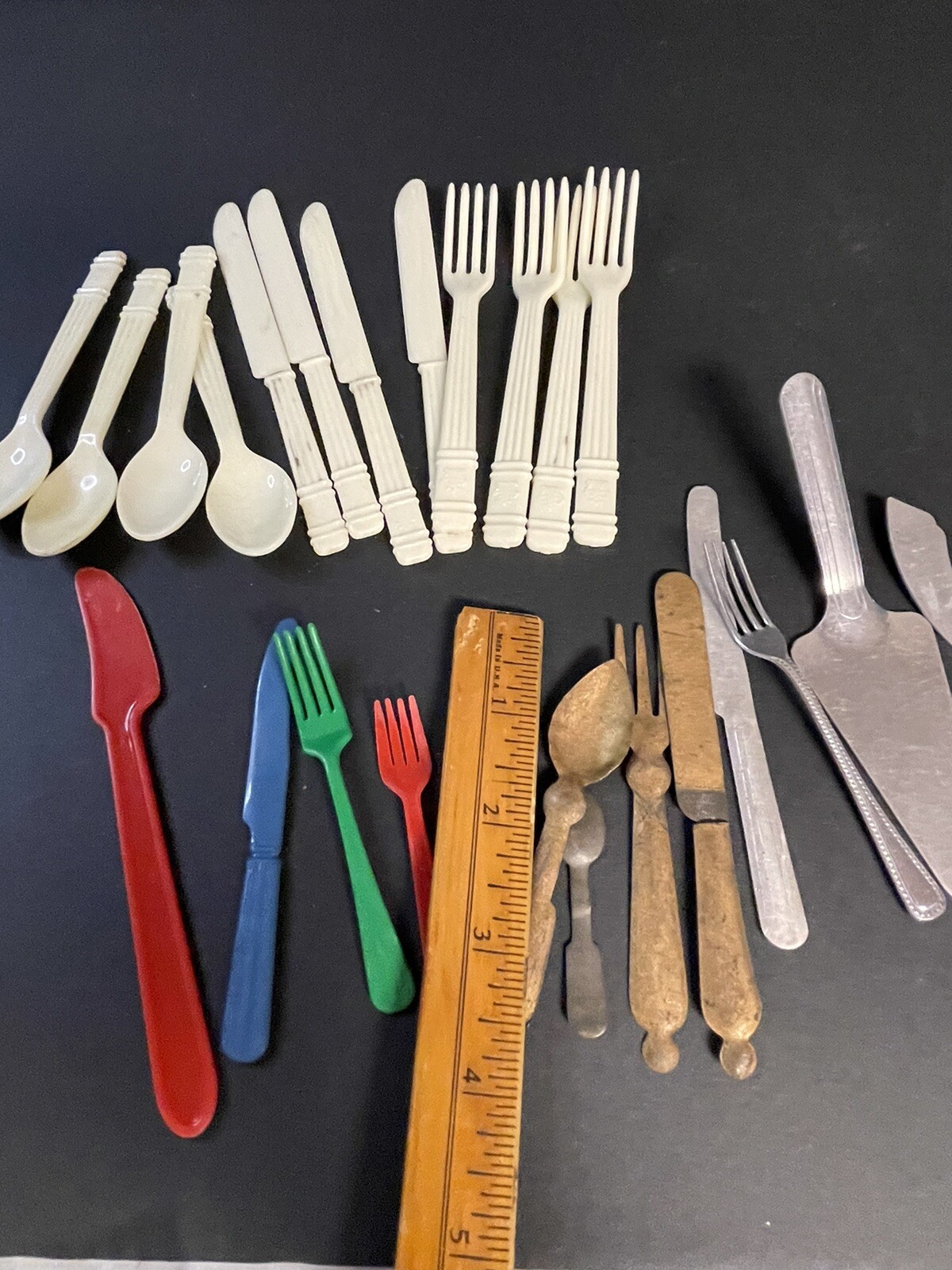 VTG Child Toy Metal Flatware Tea Set Dining Utensils Forks Knives Spoon 5 Piece