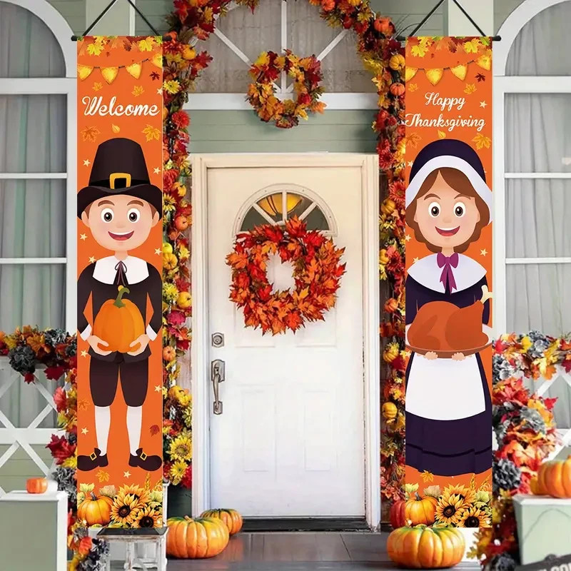 • Thanksgiving Door Banner Pilgrims Boy Girl Happy Thanksgiving
