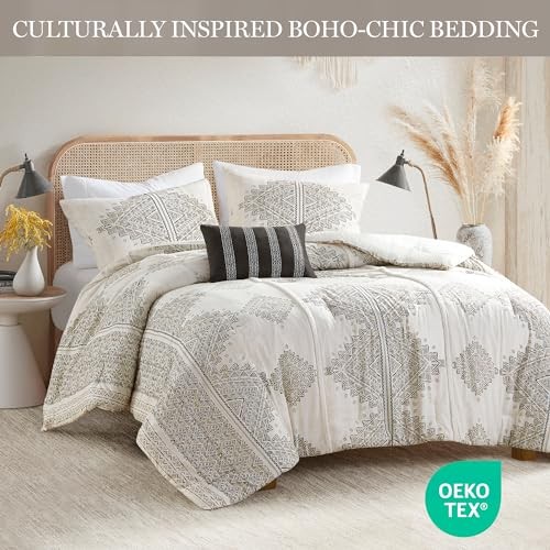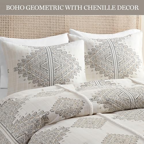 Queen Comforter Set, Boho Comforters with Chenille Full/Queen Black/Ivory