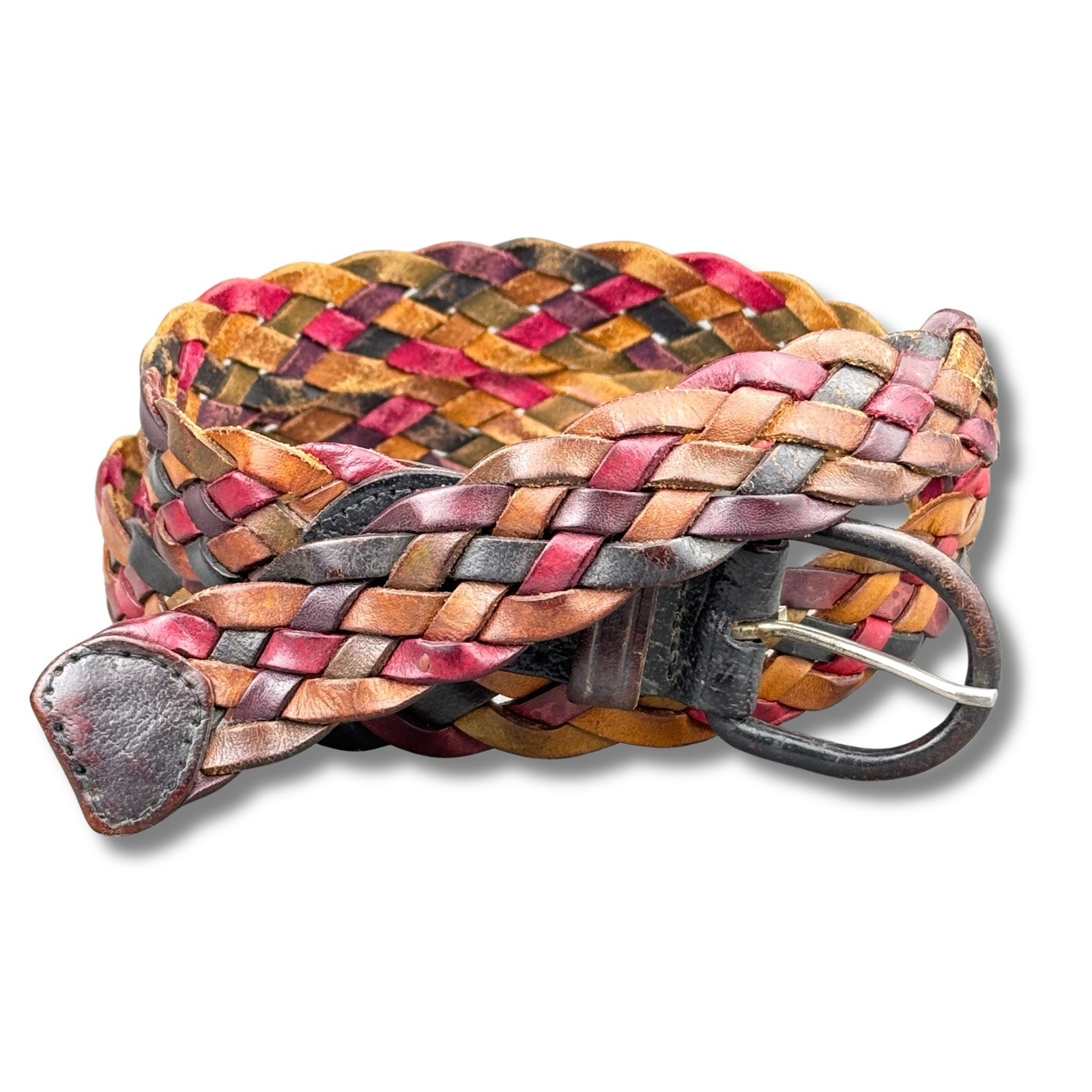 как выглядит VTG Omega Braided Leather Belt Wmn L 38" Multicolor Woven Leather Covered Buckle фото