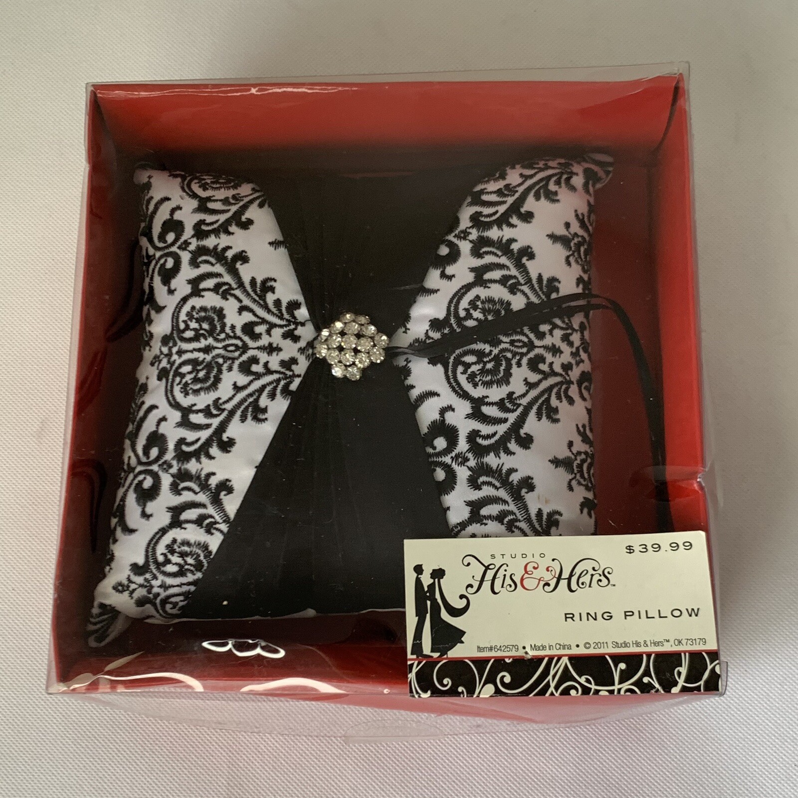 Studio His Hers Ring Pillow Damask Black White Rhinestone Floral Wedding Bearer