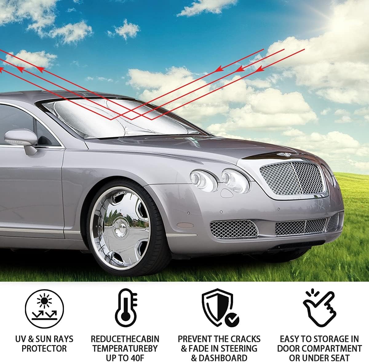 Foldable Windshield Sun Shade, Bonus Steering Wheel Sun Shield-63x35.4