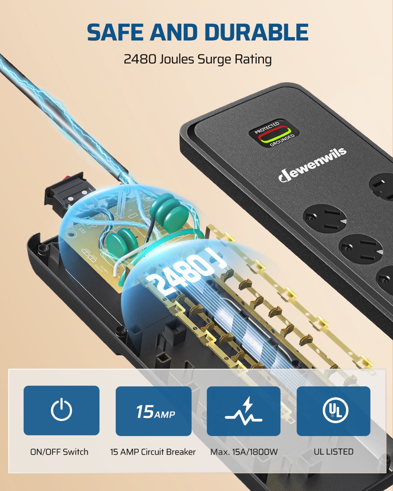 DEWENWILS 10-Outlet Surge Protector Power Strip with 4 USB Ports, 15 FT 2480J