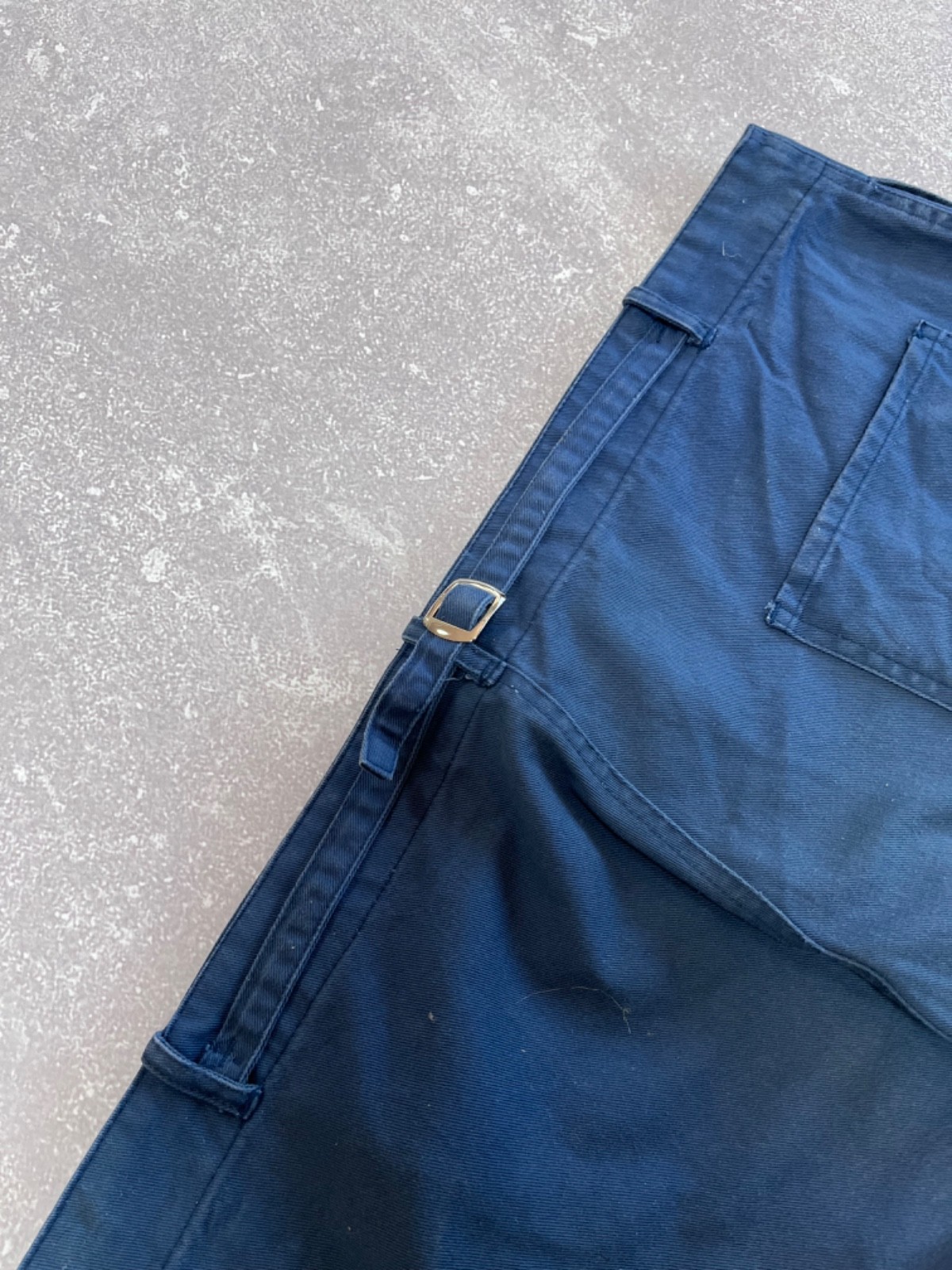 как выглядит French 1950s Faded Repaired Blue Cotton Twill Work Chore Pants фото