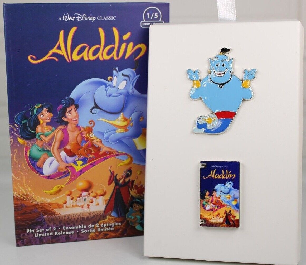 • DISNEY ALADDIN GENIE VHS PIN SET LIMITED RELEASE SET OF 2 WITH COLLECTOR BOX NEW
