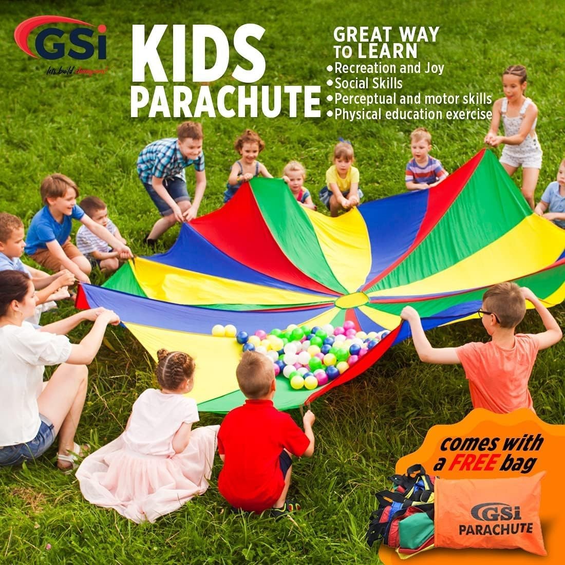 12 Ft Kids Rainbow Play Parachute Group Game for School, Outdoor Parties Fun
