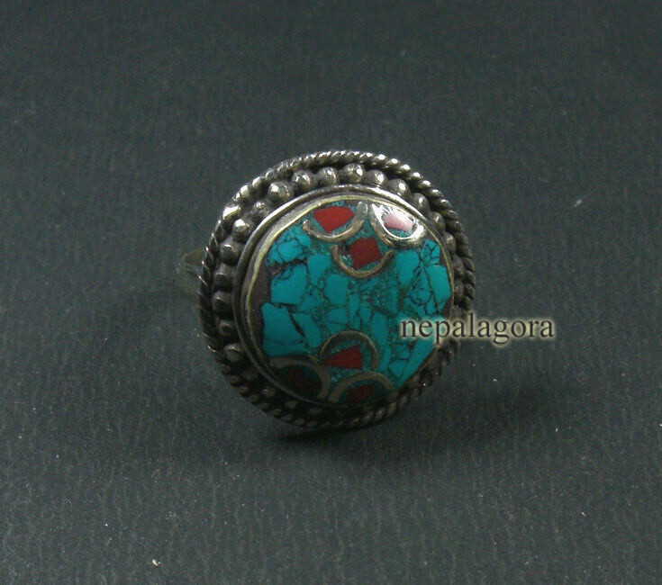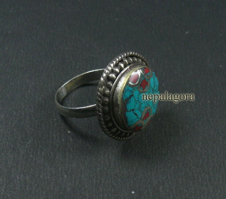 R19 Handmade size 10.50 Turquoise Coral Resin Tibetan Silver Finger Ring Nepal