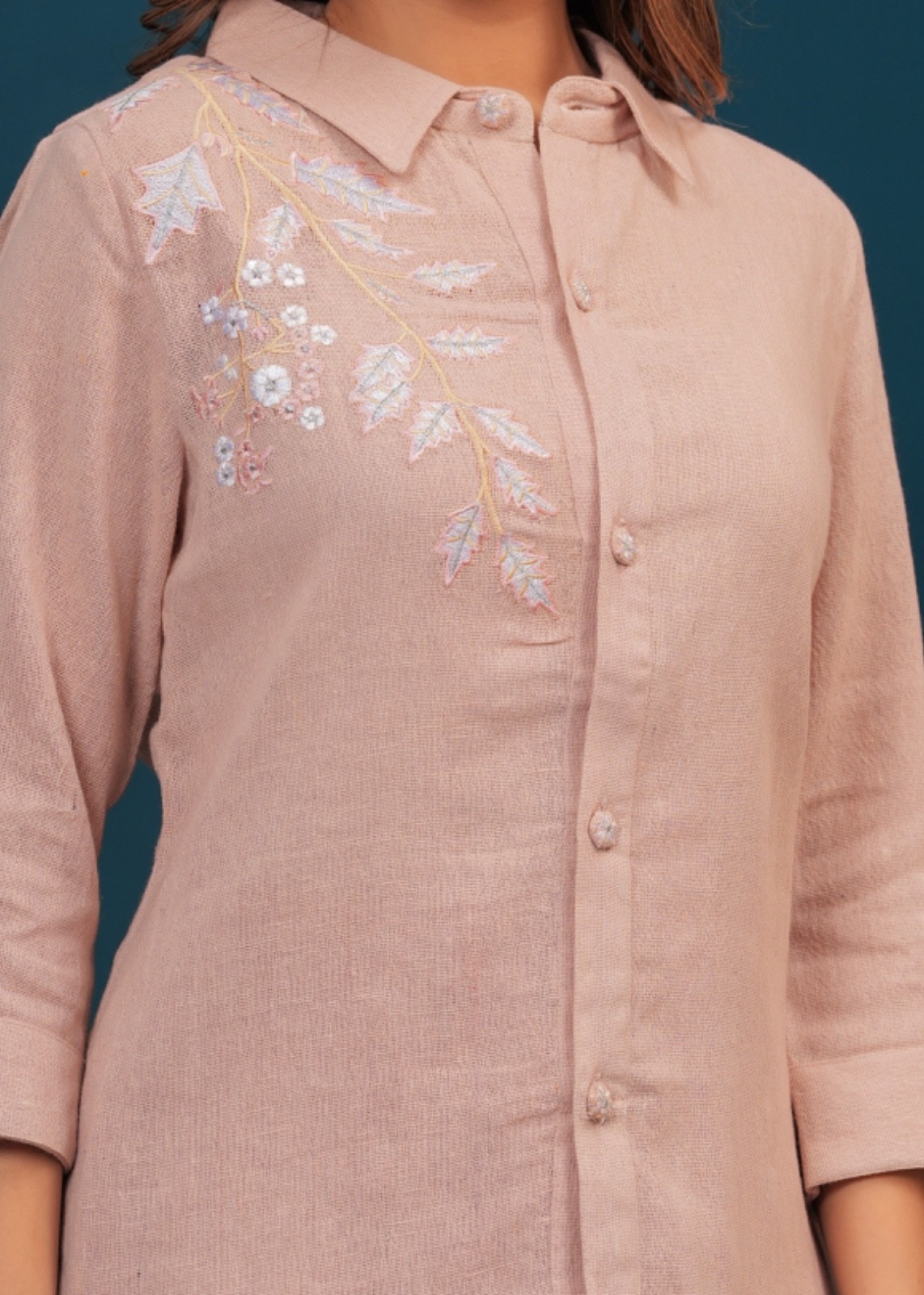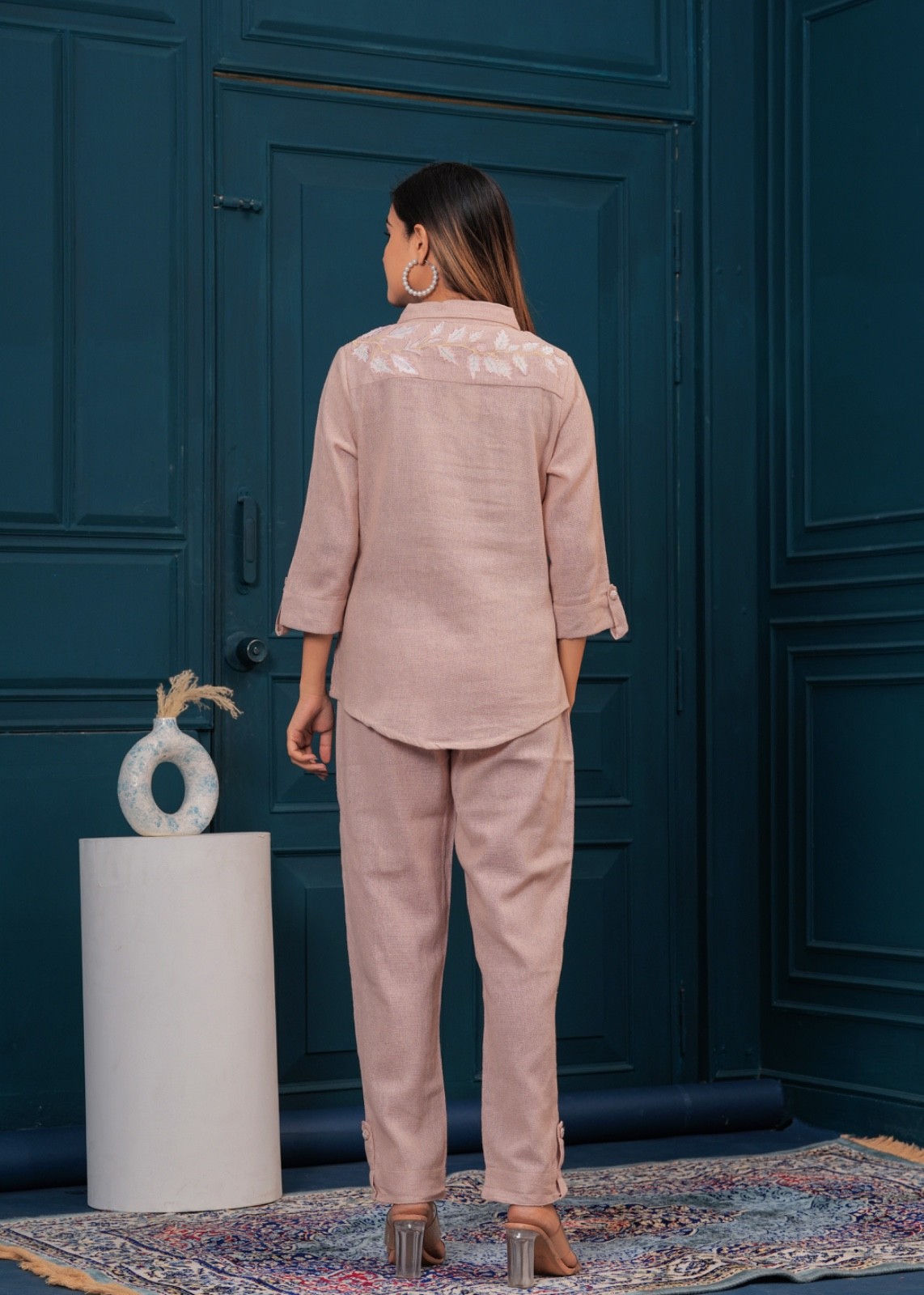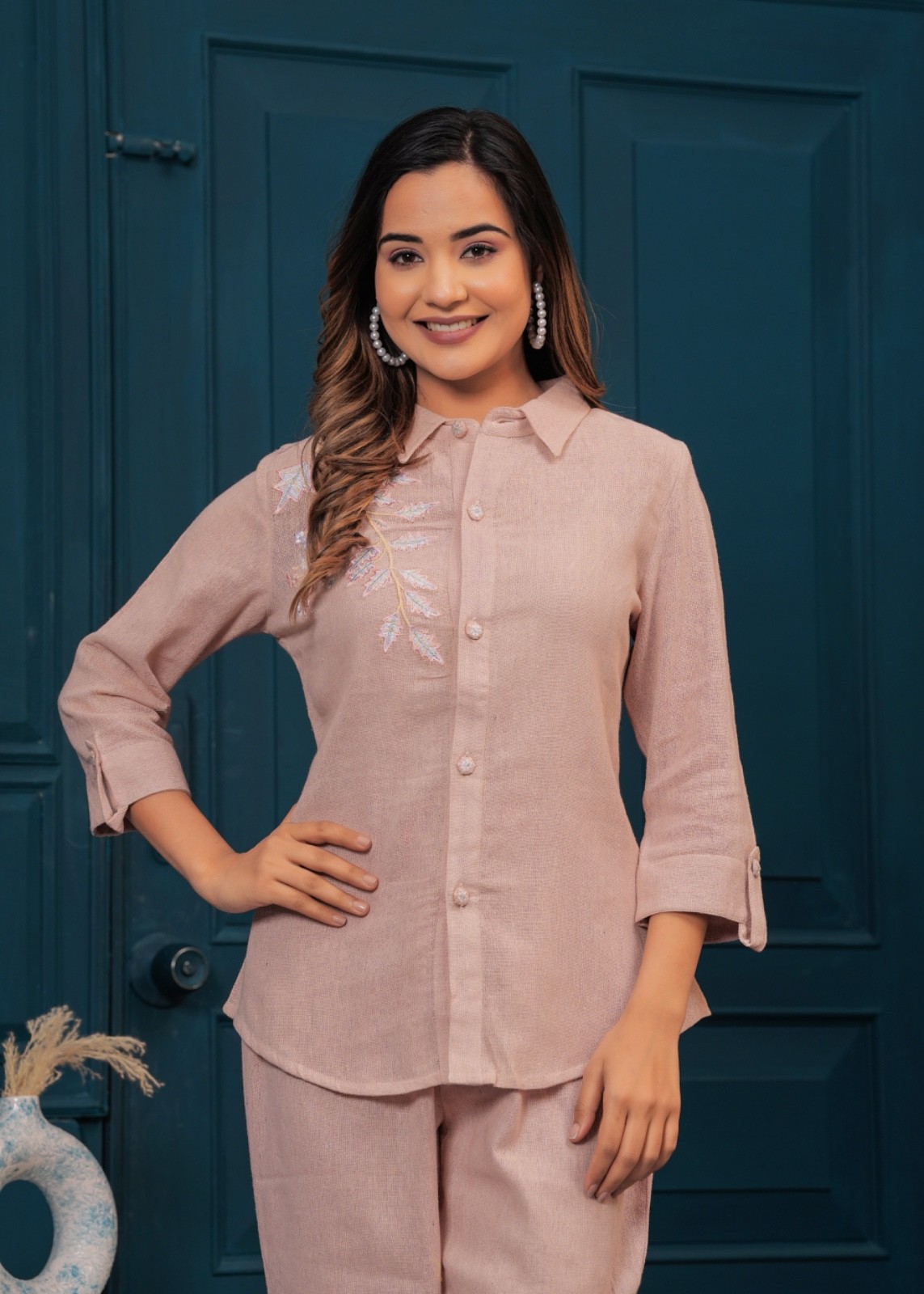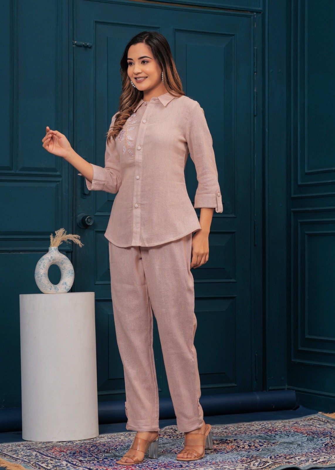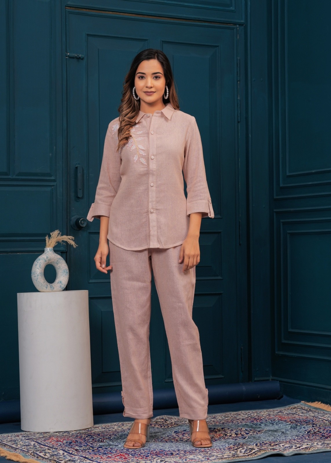 Women s Co-Ord Set Light Pink Cotton Blend Shirt Pant Casual Outfit