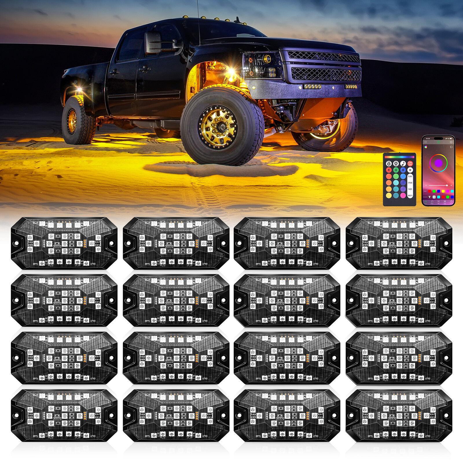 16 Pods RGBW LED Rock Lights Full Angle Underglow Wheel Well Light for Truck UTV