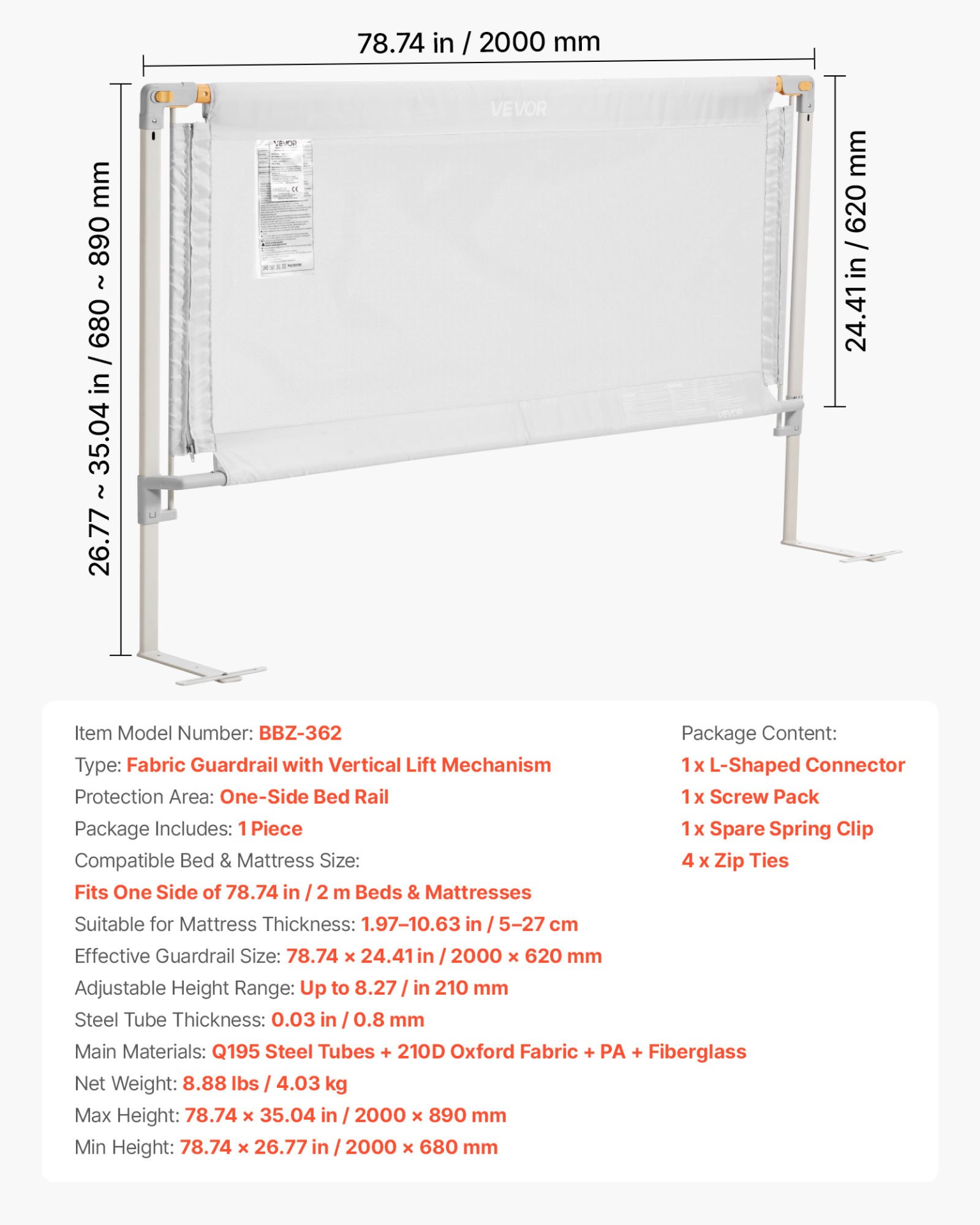 VEVOR Toddler Bed Rail Adjustable Height Bed Side Railing Guard Bumper 1 Piece