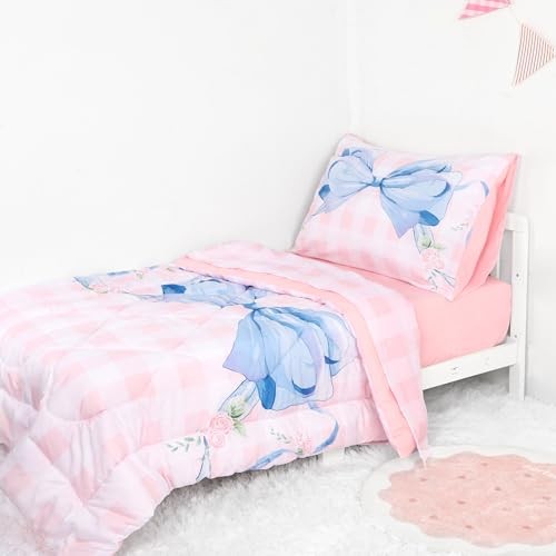 Toddler Bedding Set for Girls, Pink Gingham Bow Toddler Comforter Set, 4