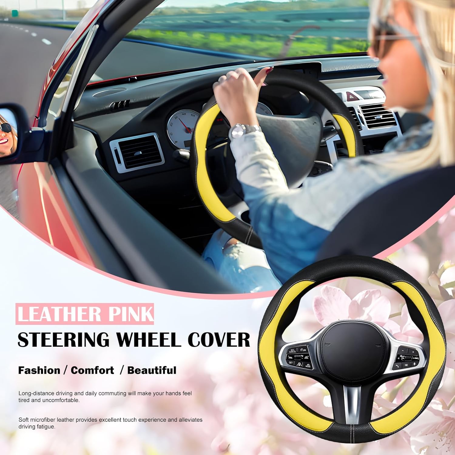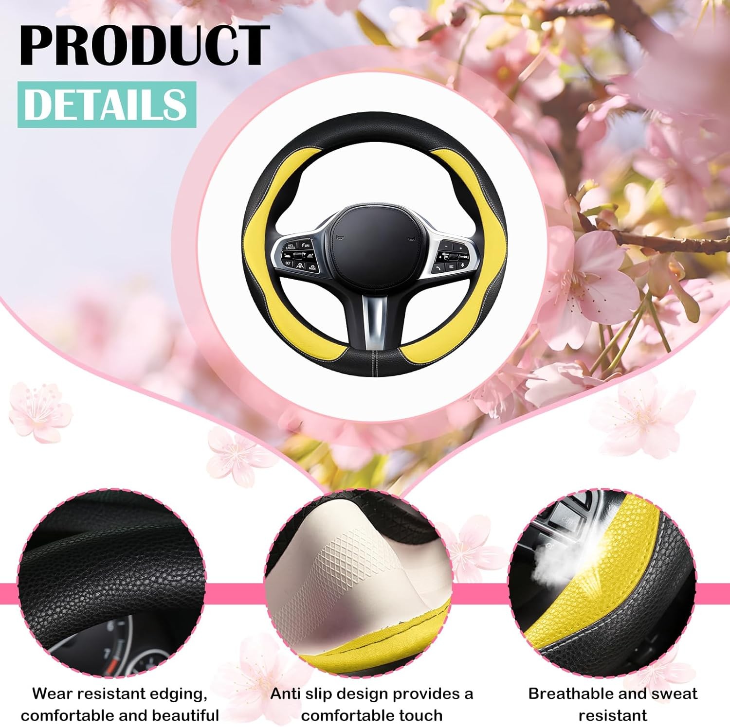 • Car Steering Wheel Cover 2025, Universal Auto PU Cute Breathable-Yellow