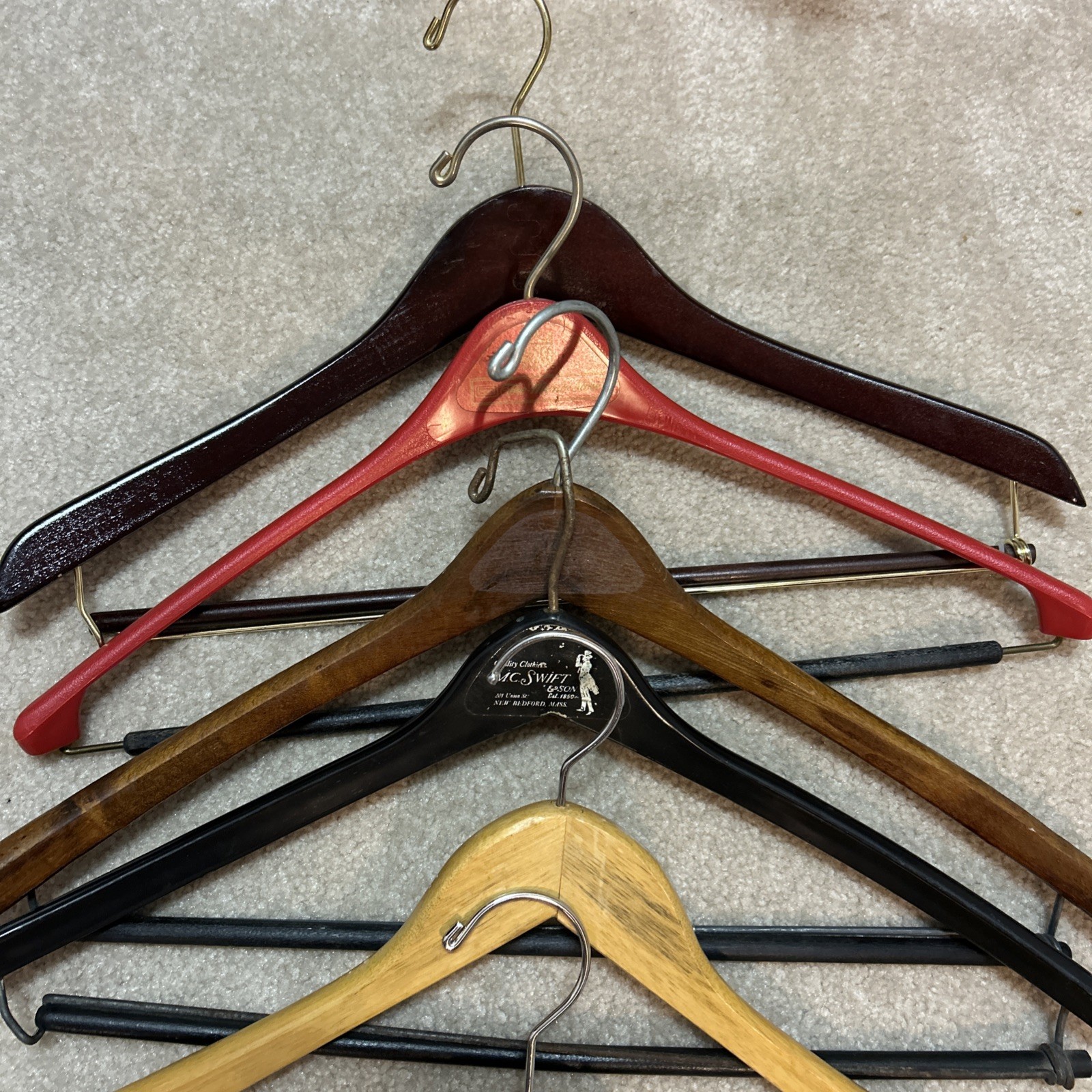 как выглядит 17 Vintage And New Wood Plastic Suit Hangers. фото