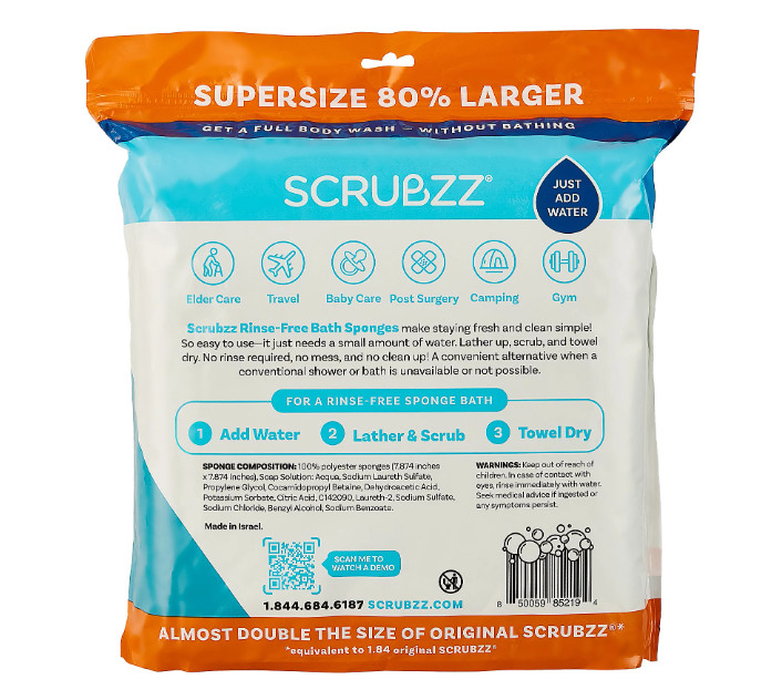 SCRUBZZ 60ct Rinse-Free Bath Sponges Super Size Single Use Soap Shampoo