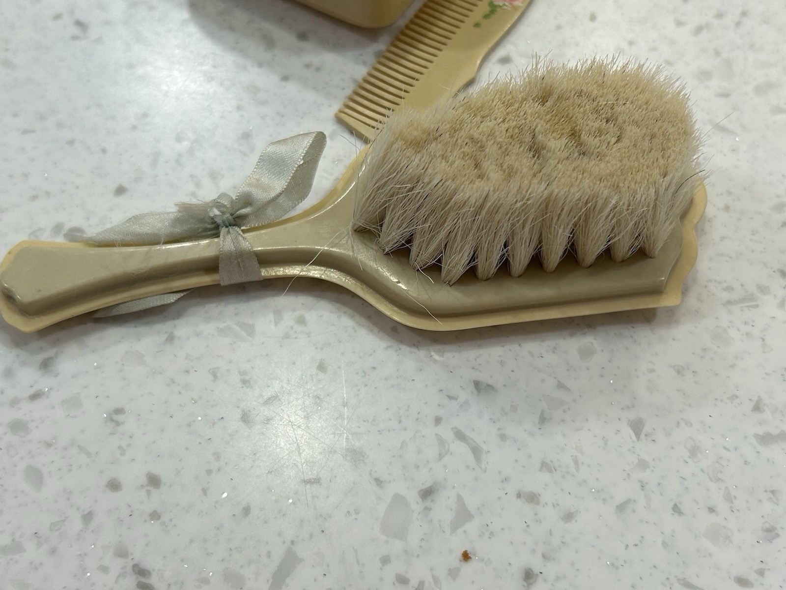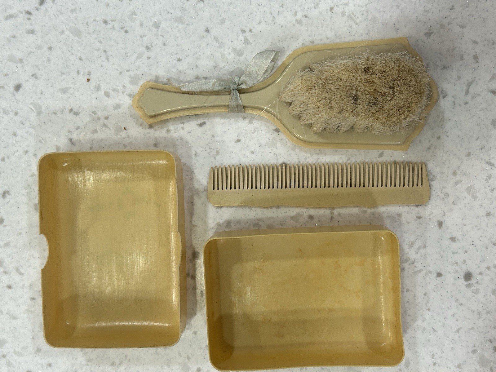 как выглядит Vintage 3 Pcs. Set Baby Celluloid Comb, Brush And Soap Dish Vanity Set фото