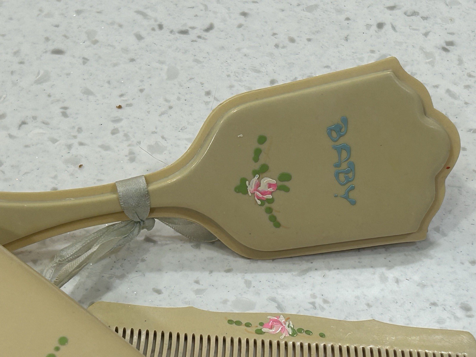 • Vintage 3 Pcs. Set Baby Celluloid Comb, Brush And Soap Dish Vanity Set