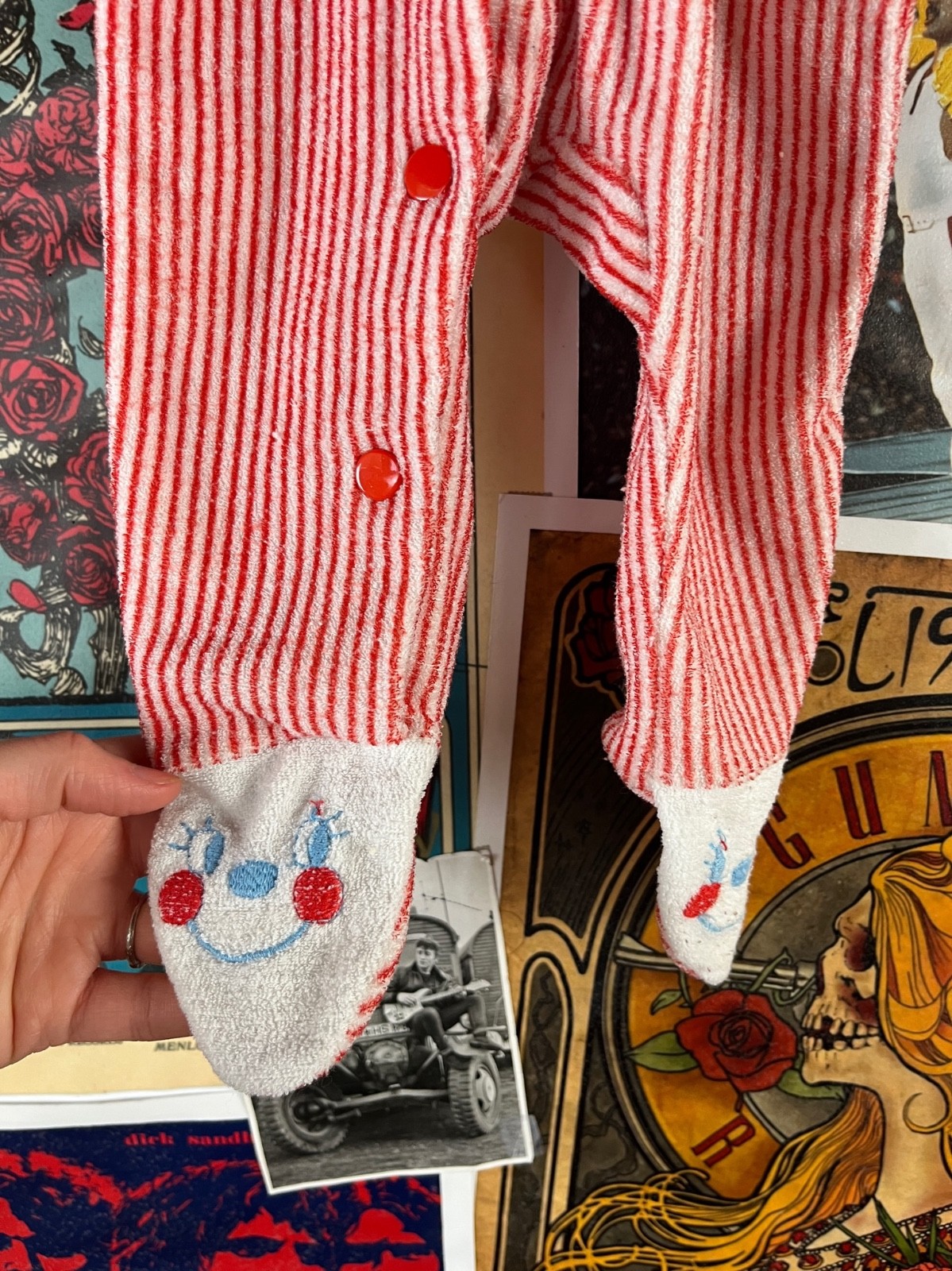 как выглядит Vtg Baby Kids Retro 60s-70s Red White Candy Stripe Footie Pajama 3-6M Face фото