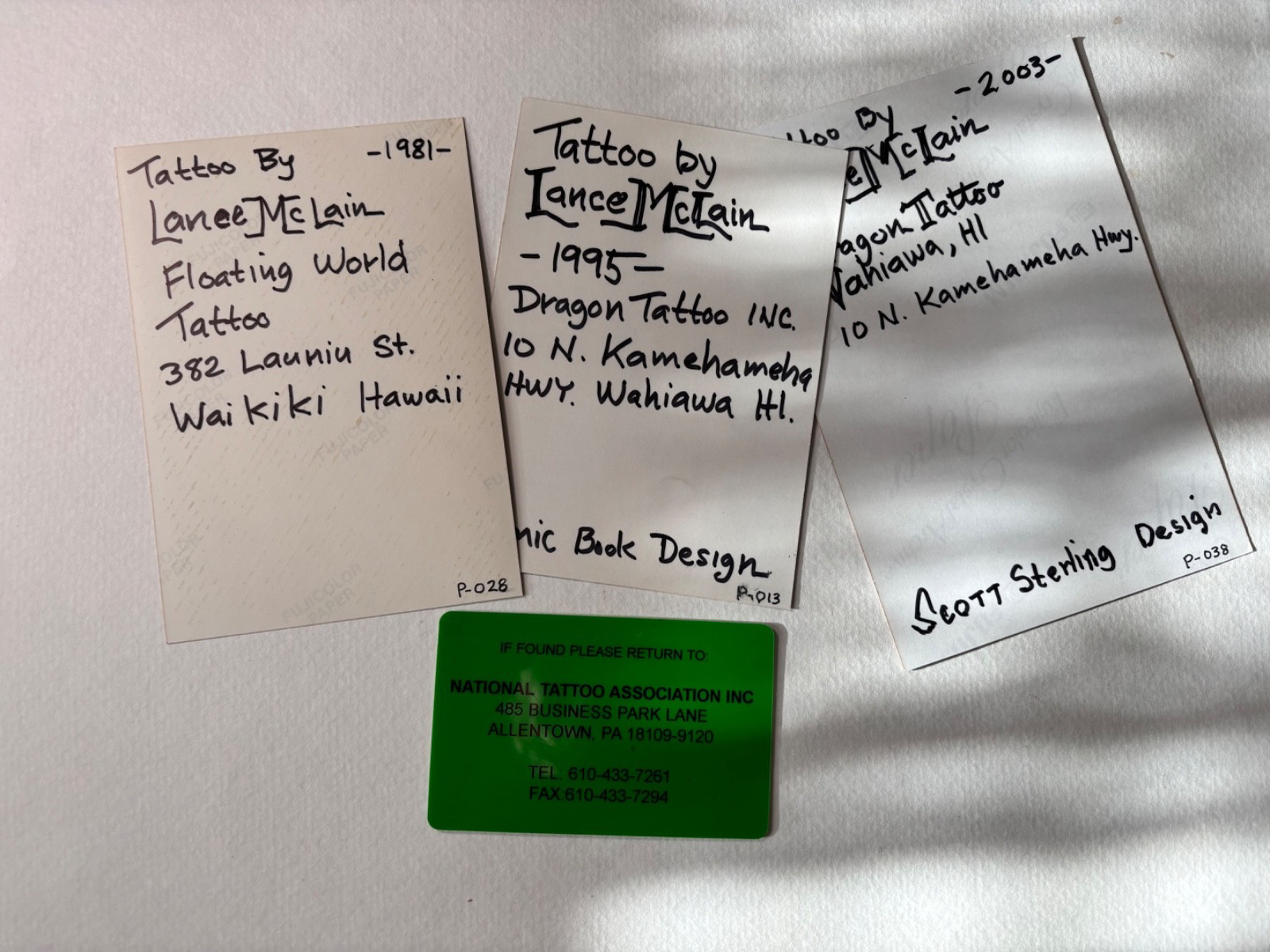 National Tattoo Assoc. card and 3 Photos of Lance McLain tattoos. Vintage Hawaii